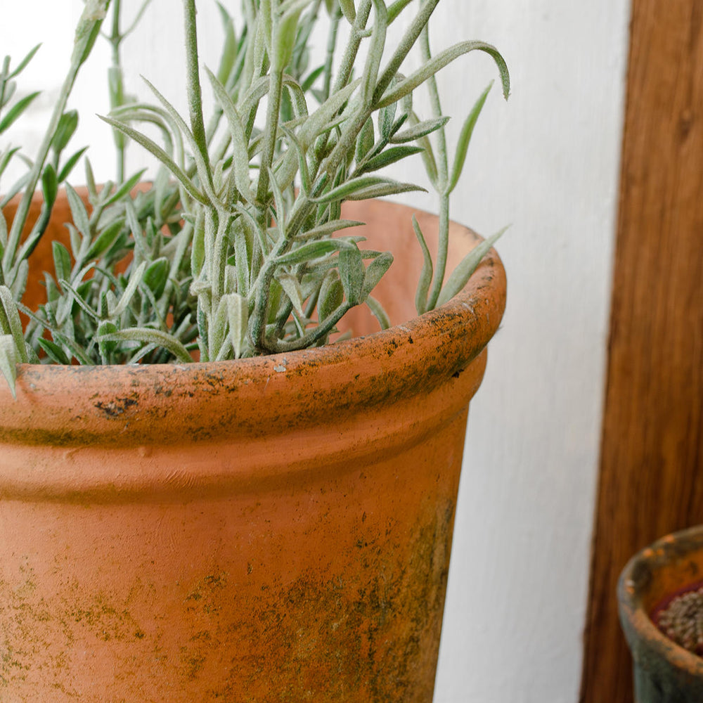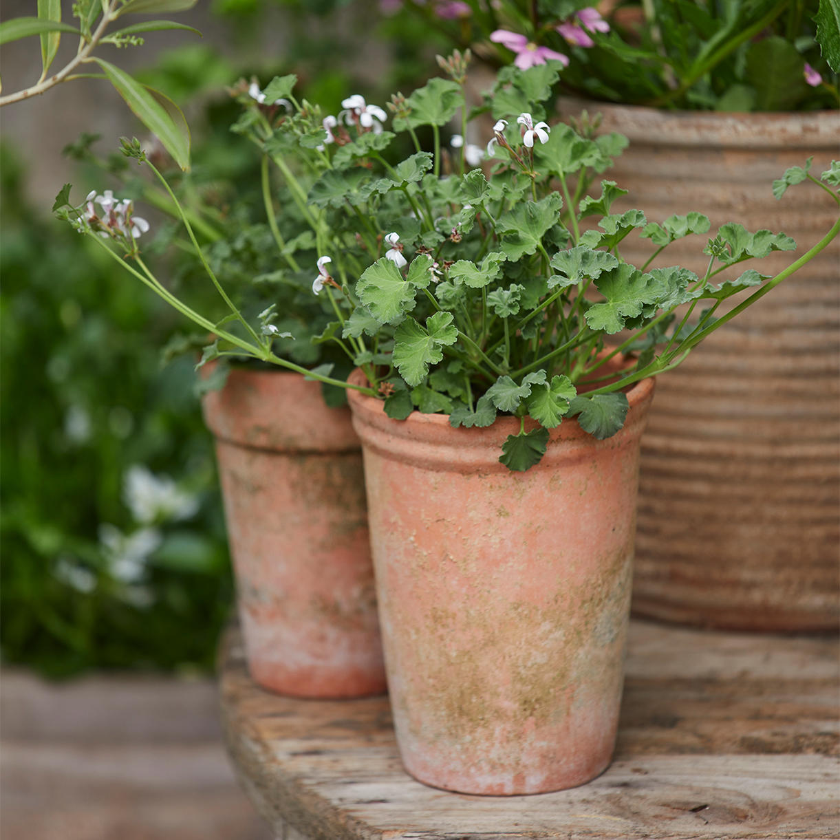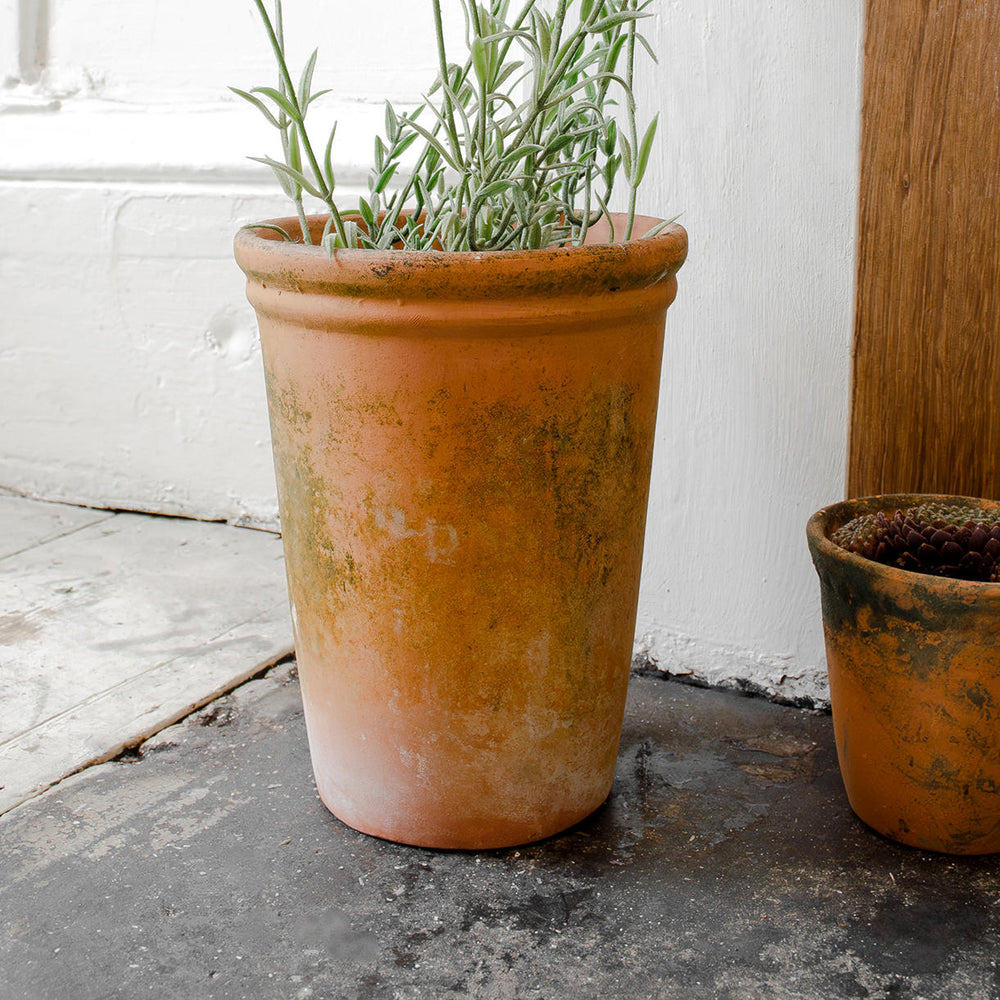 This delightful classic shaped terracotta plant pot with a rustic vintage patina in green moss so the pot looks as though it has been tucked at the back of a Victorian greenhouse for years.