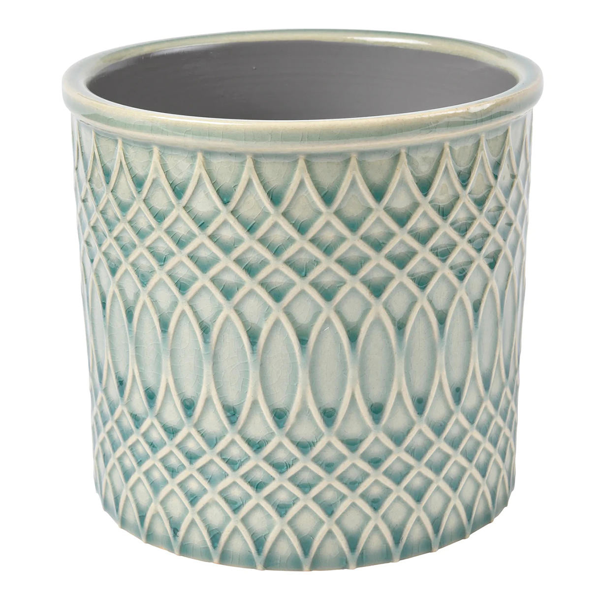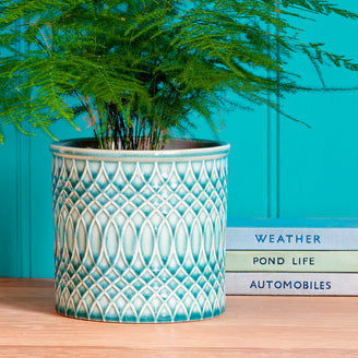 Delightful indoor plant pots in soft shades of turquoise blue with a moorish style geometric design.