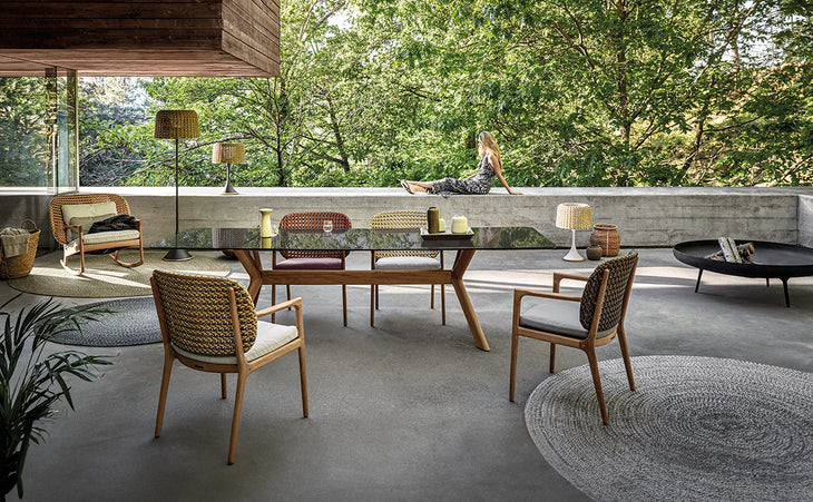 Have the ultimate statement set for your outdoor space. Designate your areas using rugs, and give one of your guests the option to lounge whilst they wait for the main event. Your other guests won't miss out as they sit in the matching Kay Dining Chairs. The added Deco Fire Bowl will help keep your guests warm throughout the evening into the night, and the Ambient Sol lamps will help bring that extra bit of light into your life. (Please note: X Frame Dining Table is no longer available, however, see our recommended table below.)