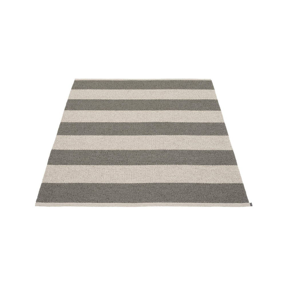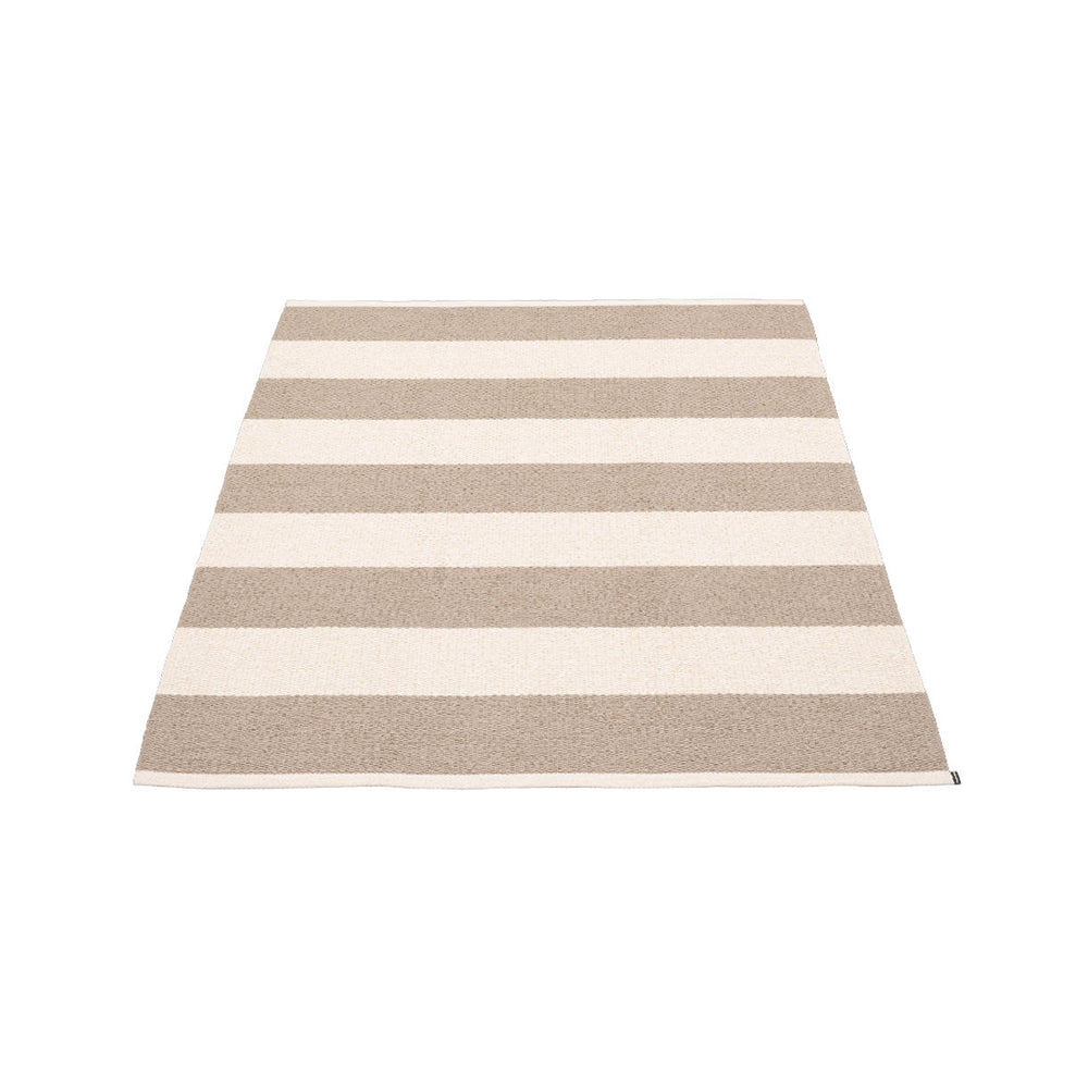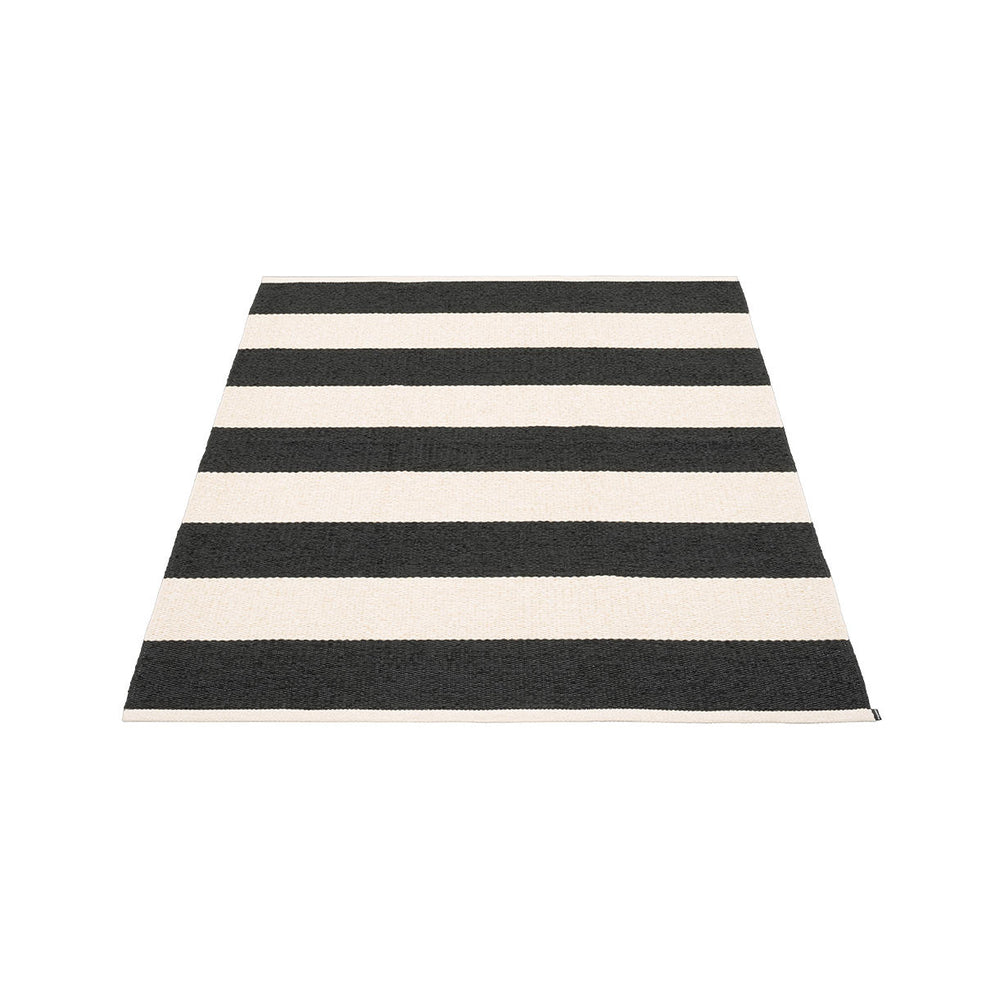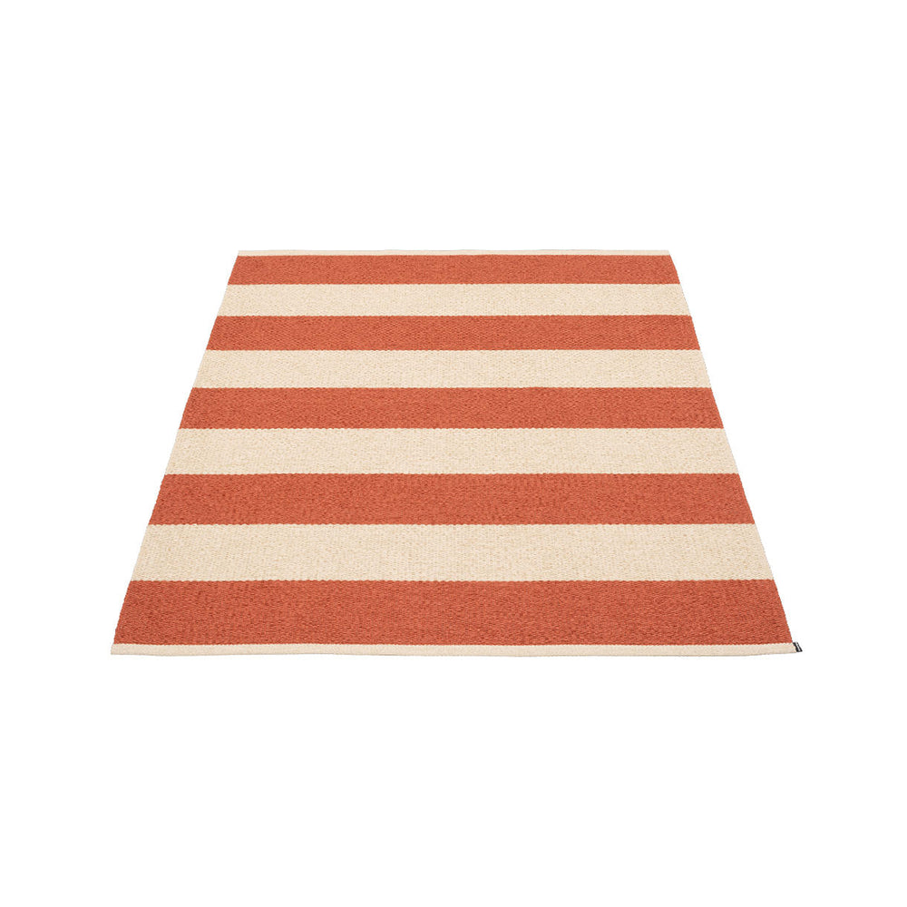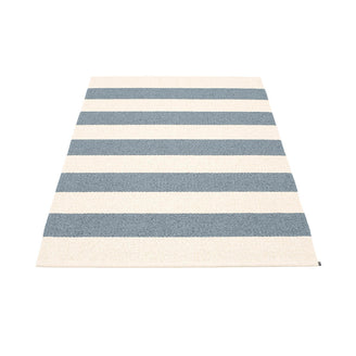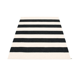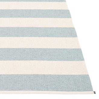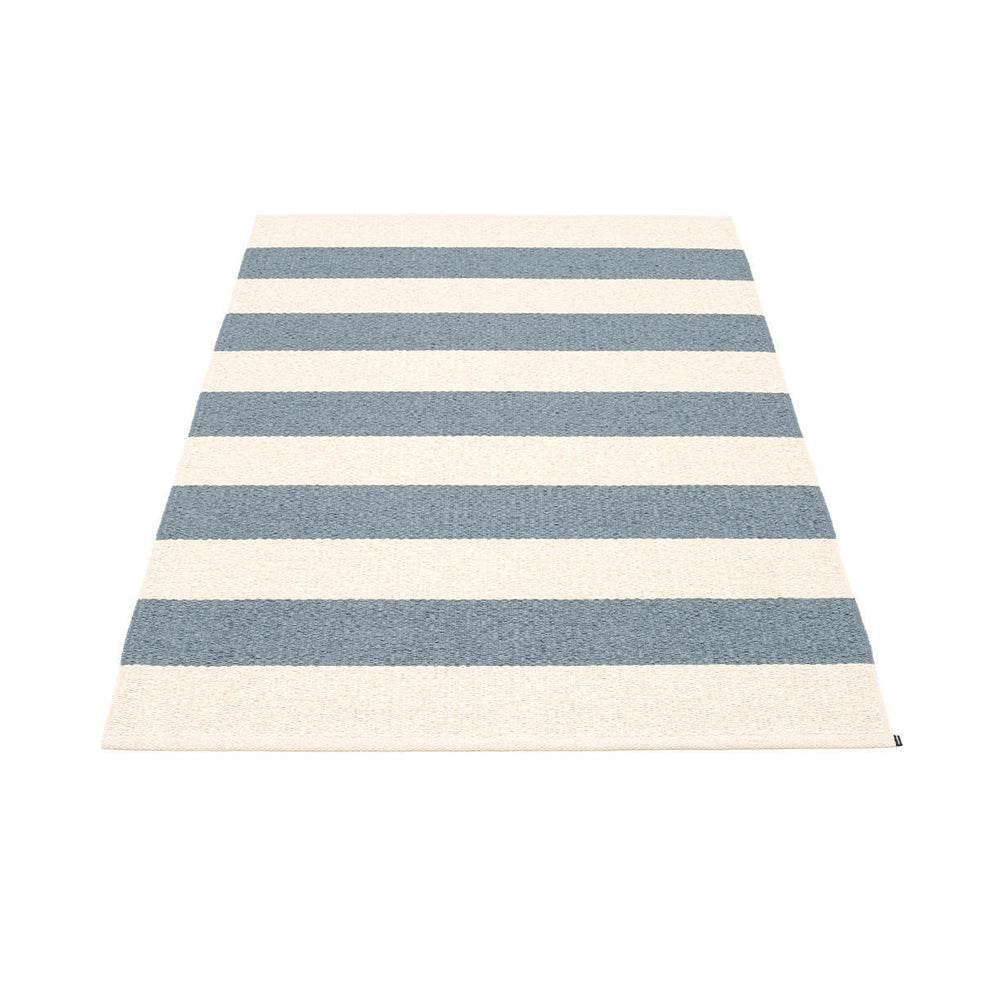 Made in Dalarna, Sweden. Woven on a traditional loom using wooden shuttles. Very practical and easy-to-care-for rug in Swedish manufactured PVC. Welded ribbon for strength and durability, with embossed Pappelina logo, at both edges. Measurements may vary ±4% as a result of the various craft processes the rugs undergo during manufacturing.