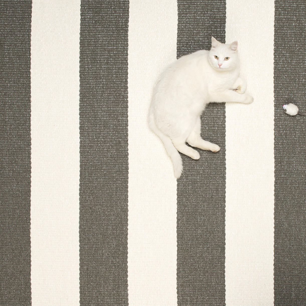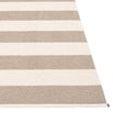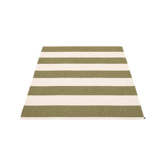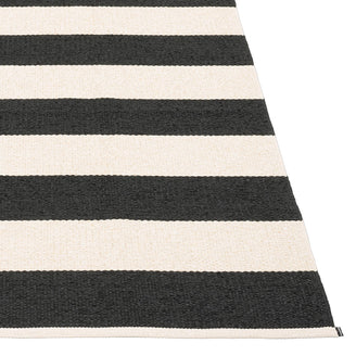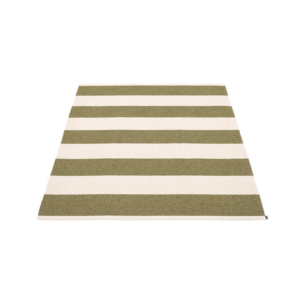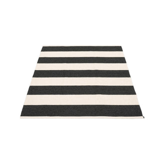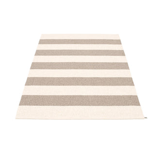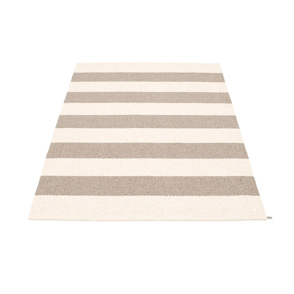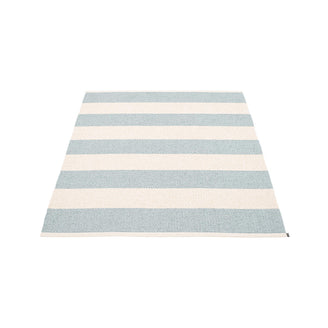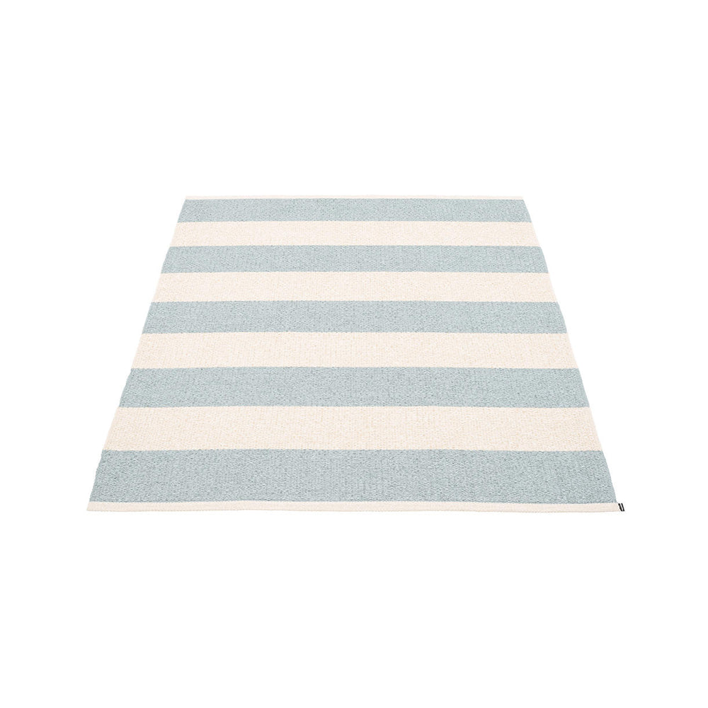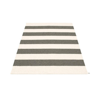 Made in Dalarna, Sweden. Woven on a traditional loom using wooden shuttles. Very practical and easy-to-care-for rug in Swedish manufactured PVC. Welded ribbon for strength and durability, with embossed Pappelina logo, at both edges. Measurements may vary ±4% as a result of the various craft processes the rugs undergo during manufacturing.