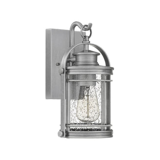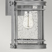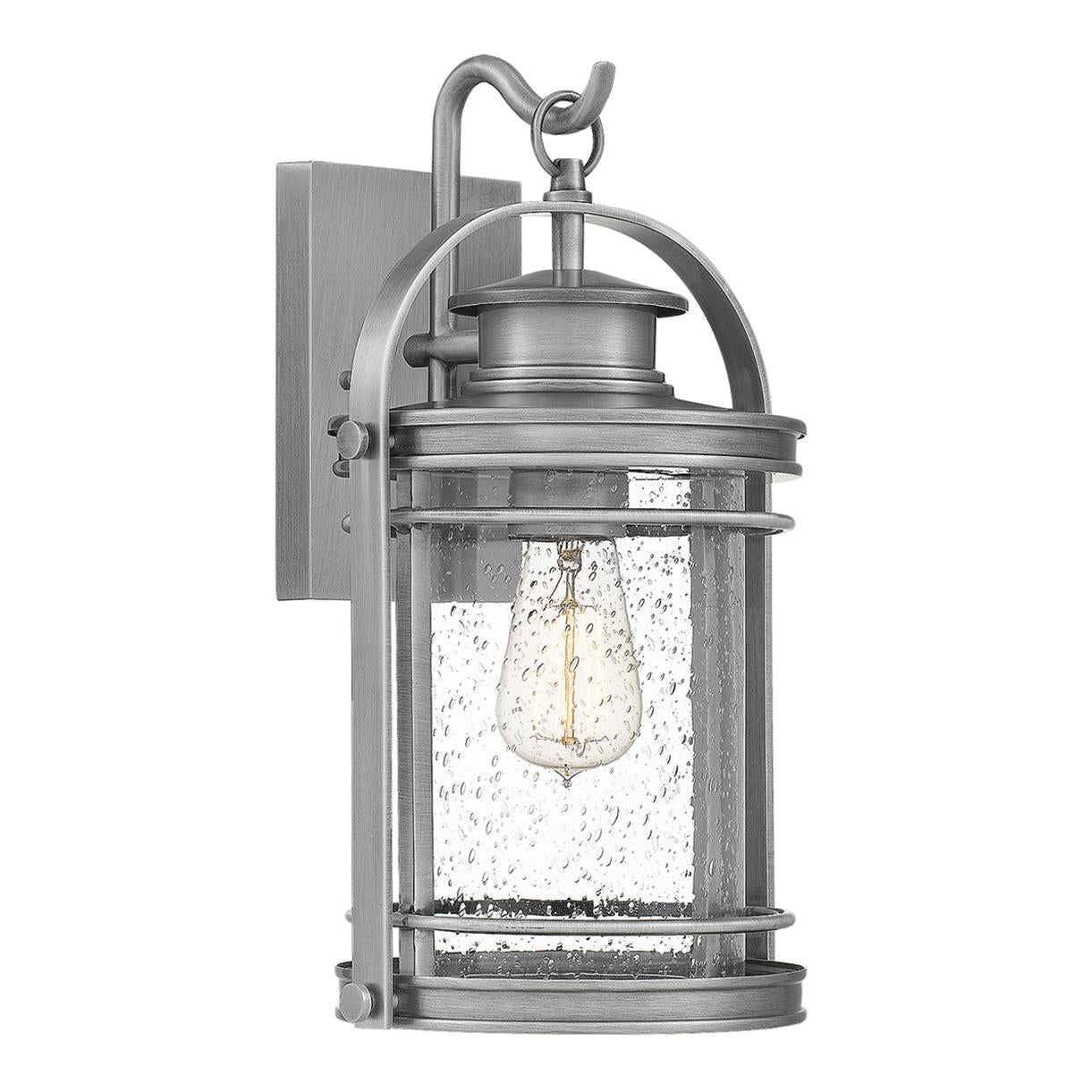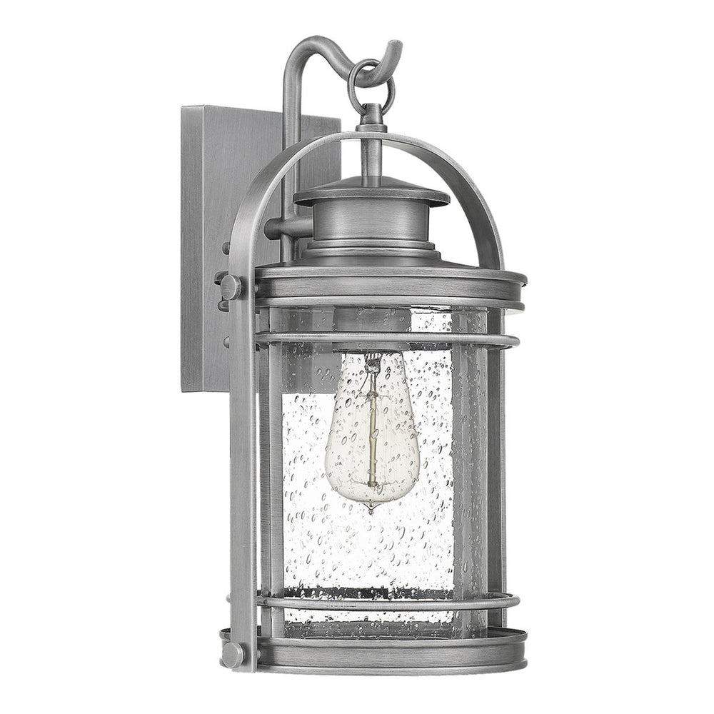 The Booker outdoor wall lantern blends the texture of seeded glass with a soft luminous silver frame. The lantern features a round trim with coordinated curved arm and rivet style detailing. The industrial grade aluminium fitting stands up to the elements comfortably.