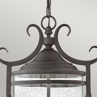 This aluminium hanging light has an olde black finish and with clear seeded glass gives an authentic finish and a warm welcome to guests at your door.