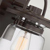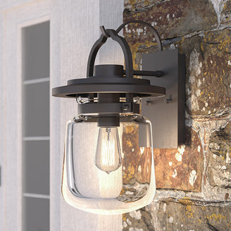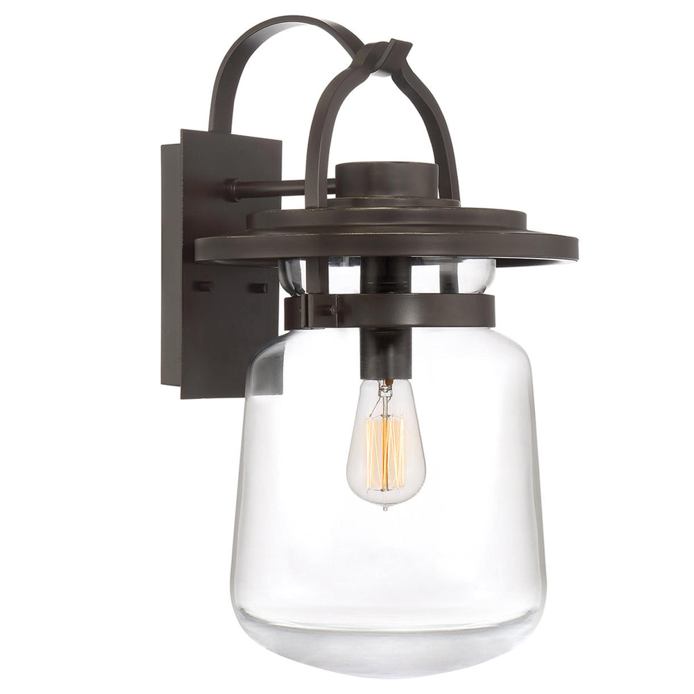 The glass is clear and is shaped like an oversized jar which exquisitely showcases a filament lightbulb.