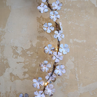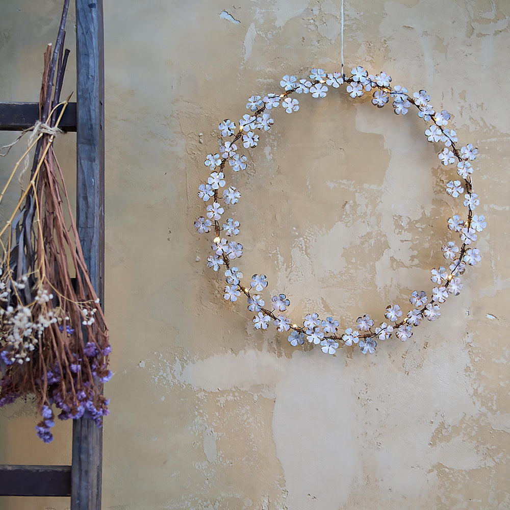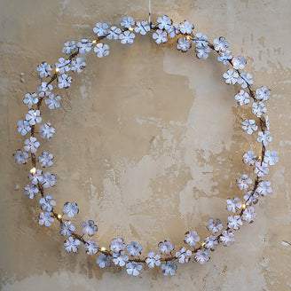 Very pretty battery-operated circular metal wildflower styled LED lights in an off white vintage washed finish.