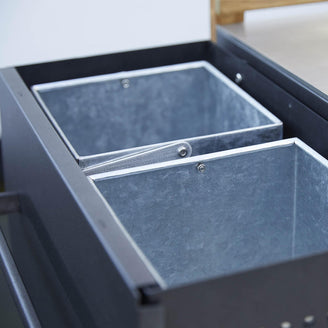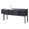 The kitchen unit is manufactured in powder-coated aluminium with a stainless steel work surface.