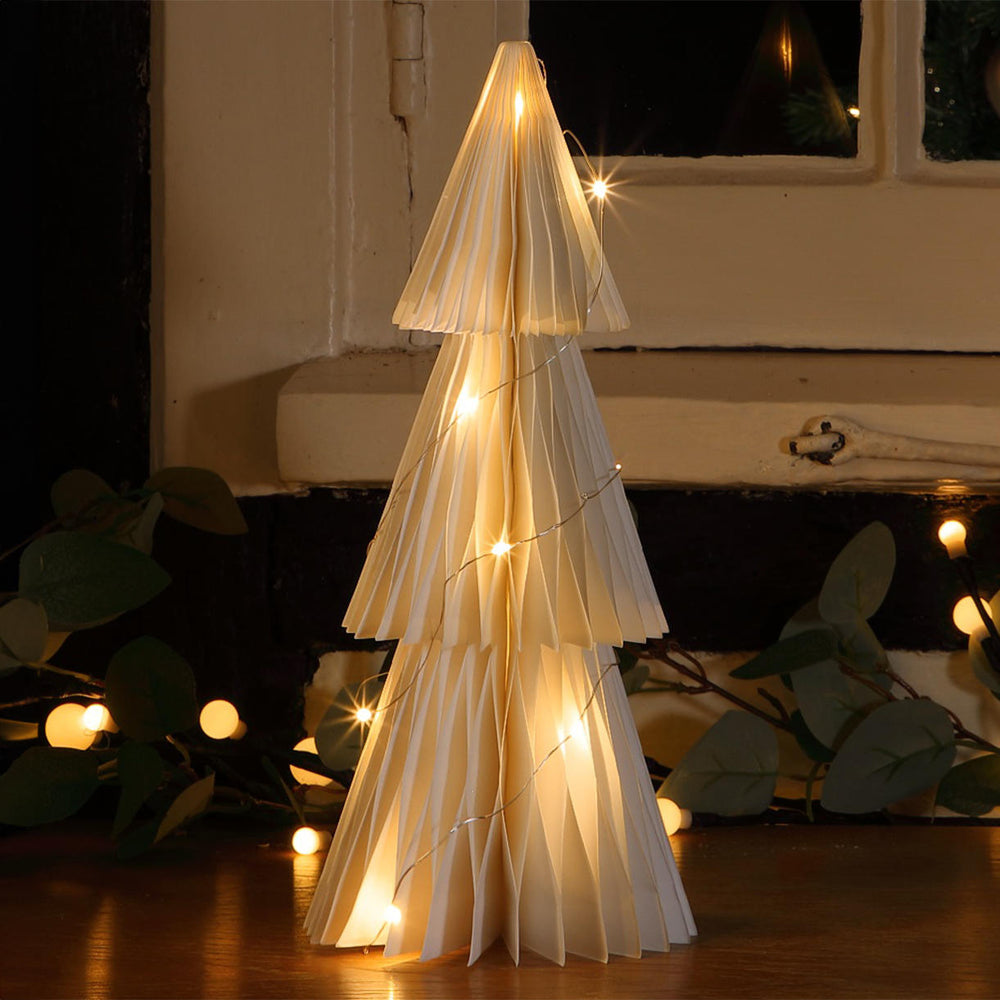 Bring a dash of Scandi charm to your festive décor with this Christmas with our glowing Honeycomb Illuminated Tree. Crafted from elegant concertinaed synthetic paper, these festive trees unfold effortlessly, secured with neat magnetic clips for a stunning, sculptural look.