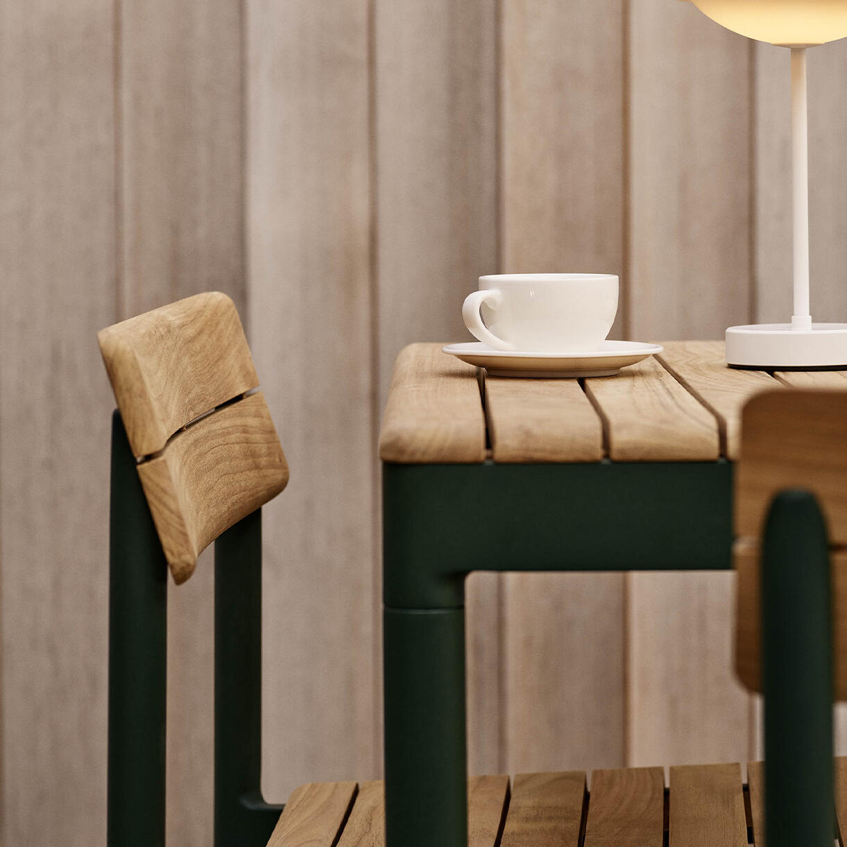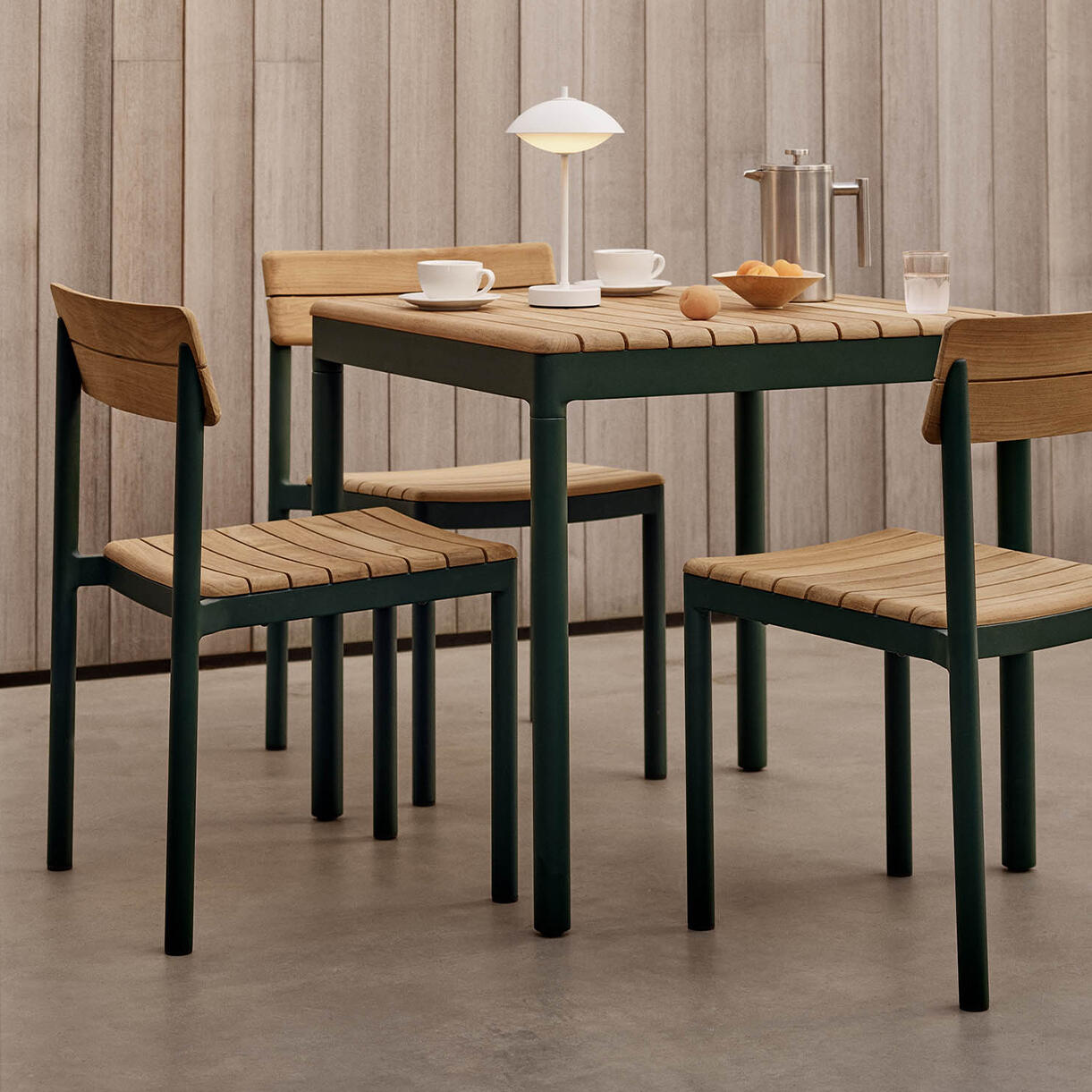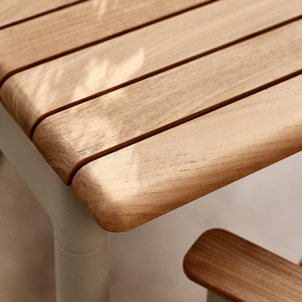 Its signature slatted curved edged, slatted teak top sits on a powder-coated aluminium frame, available in Light Ivory or Hunter Green. Choose a chair or armchair from the Pelagus collection to complement the table.