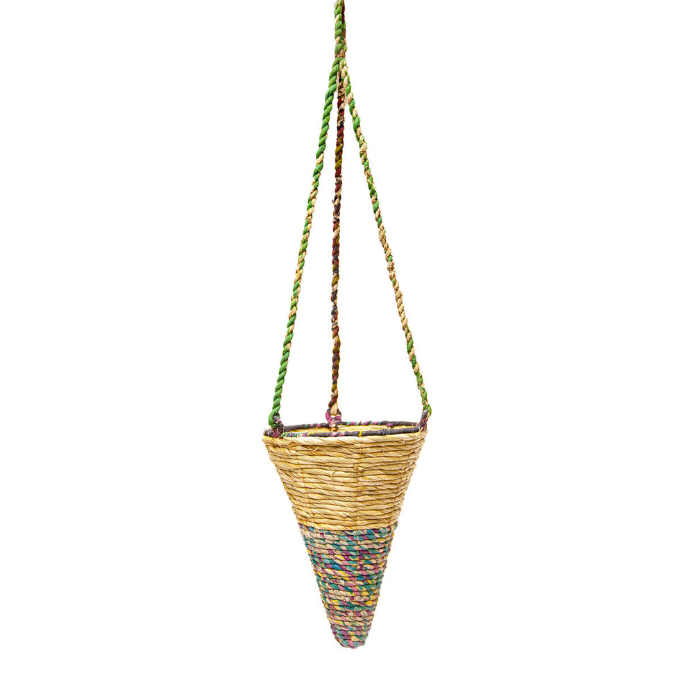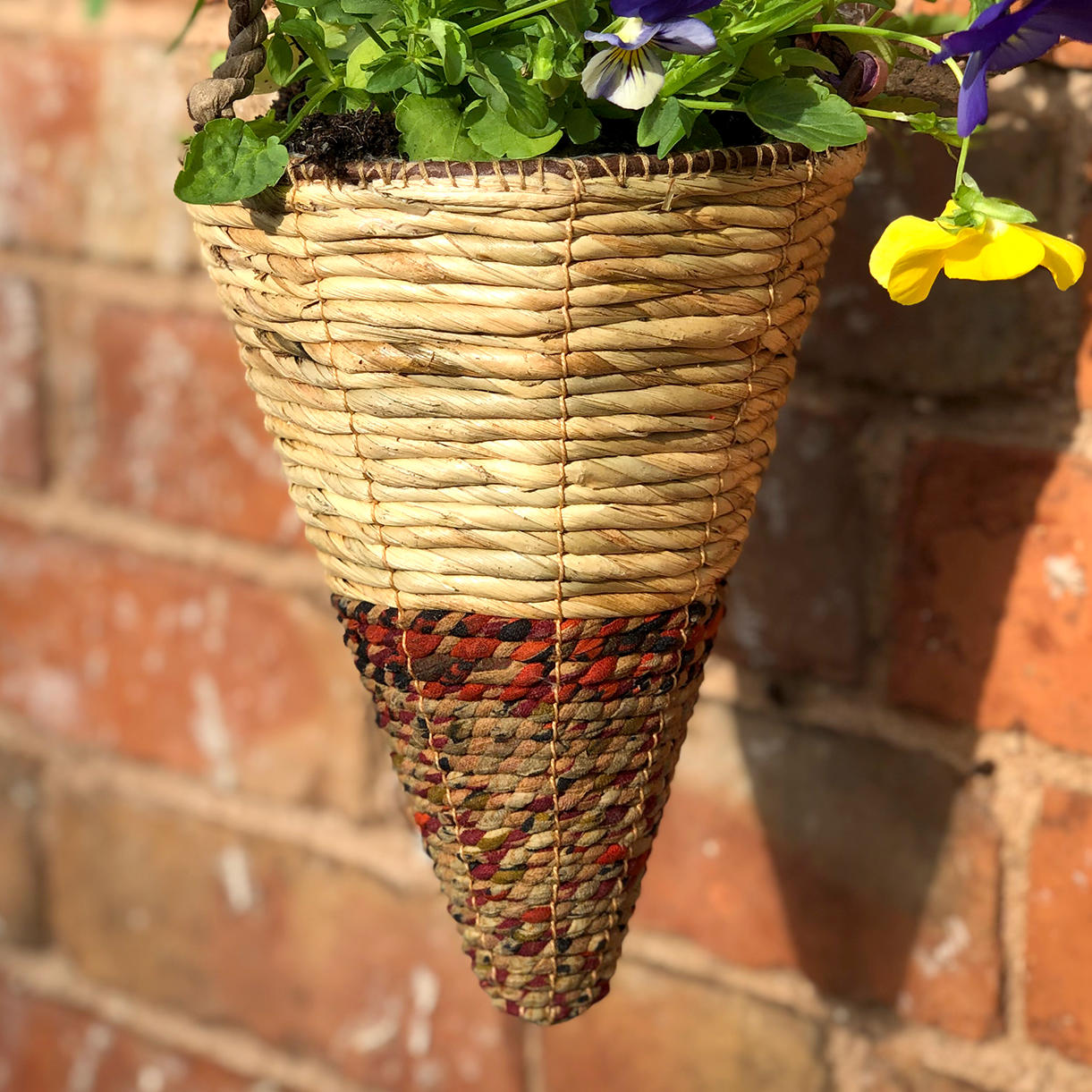 Each of these Artisan hanging baskets are handmade using recycled fabrics, therefore each is different and unique. These sturdy hanging baskets can be used indoors or outdoors, they have a liner inside the basket.