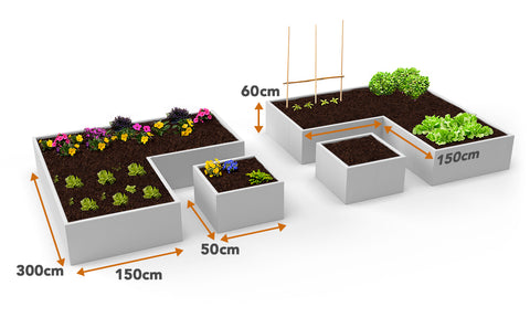 Satisfyingly symmetrical, this set of aluminium retaining walls create a large area with the traditional 'L' shape, along with smaller squares to neatly separate out various other flowers or vegetables. In the 'Traffic White' aluminium finish, this set of retaining walls can break up the greens and browns found in the garden or allotment, giving you a strong and bold look to your raised beds.