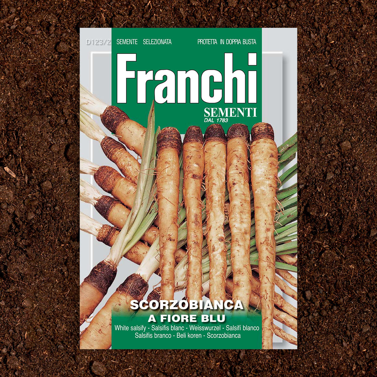 This White salsify is a late variety that produces long roots with white, tasty flesh on the inside. The plant has attractive blue flowers, rather like a very small Iris.