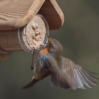 To hold the food, try a delightful little house for it that holds one jar of special birdy peanut butter, simply fix the feeder on to a wall or fence, unscrew the lid and watch the little birds, like blue tits and robins, have their peanut butter treat. It is amazing to see the birds clean out the whole jar with not a knife in sight!