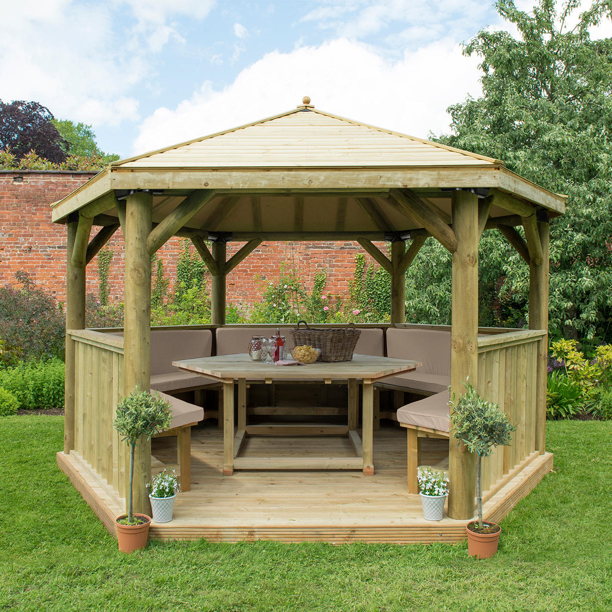 The 4m hexagonal gazebo is fully furnished, with a table and a set of bench seats, complete with cushions.