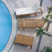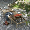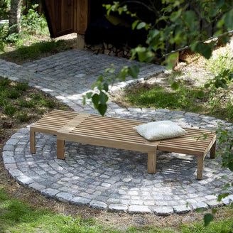 Beautifully slatted teak sunlounger which slides gently apart or together enabling it to become a backless bench, large low table or sunlounger.