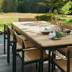 The teak tabletop has rounded edges where it meets the powder-coated aluminum.