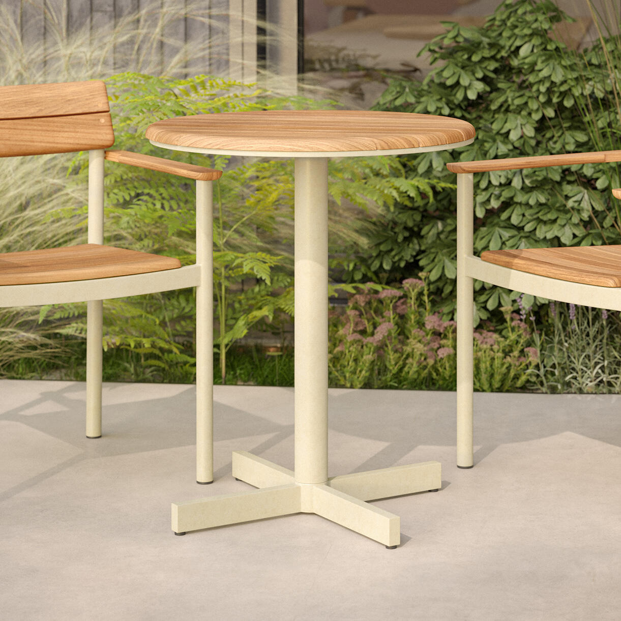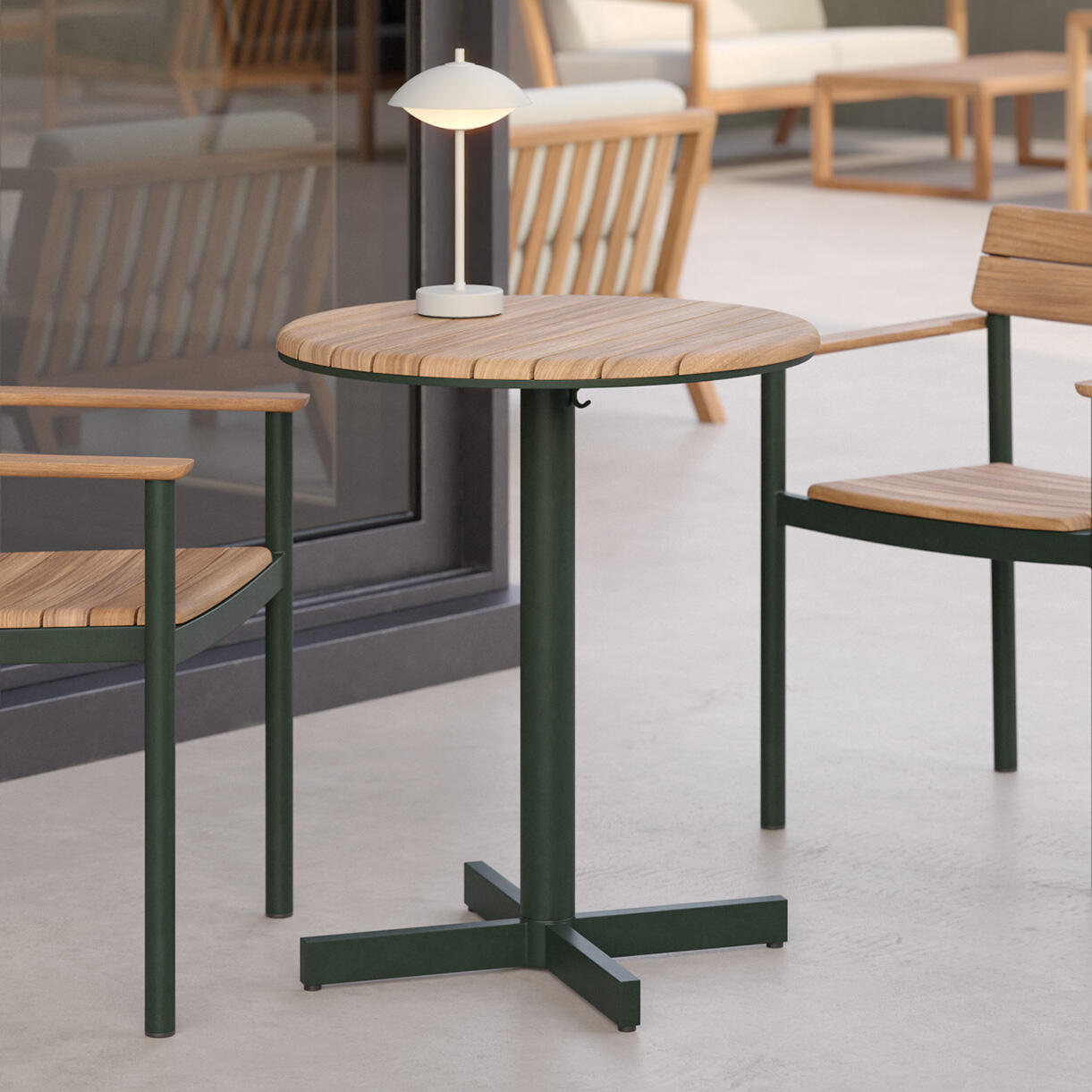 Its signature slatted curved edged, slatted teak top sits on a powder-coated aluminium frame, available in Light Ivory or Hunter Green. Choose a chair or armchair from the Pelagus collection to complement the table.