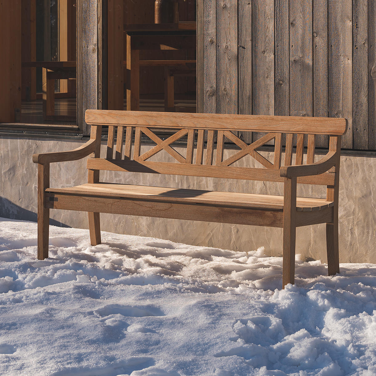 The bench can also be used in conjunction with Drachmann teak tables, for more casual and informal dining.