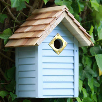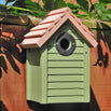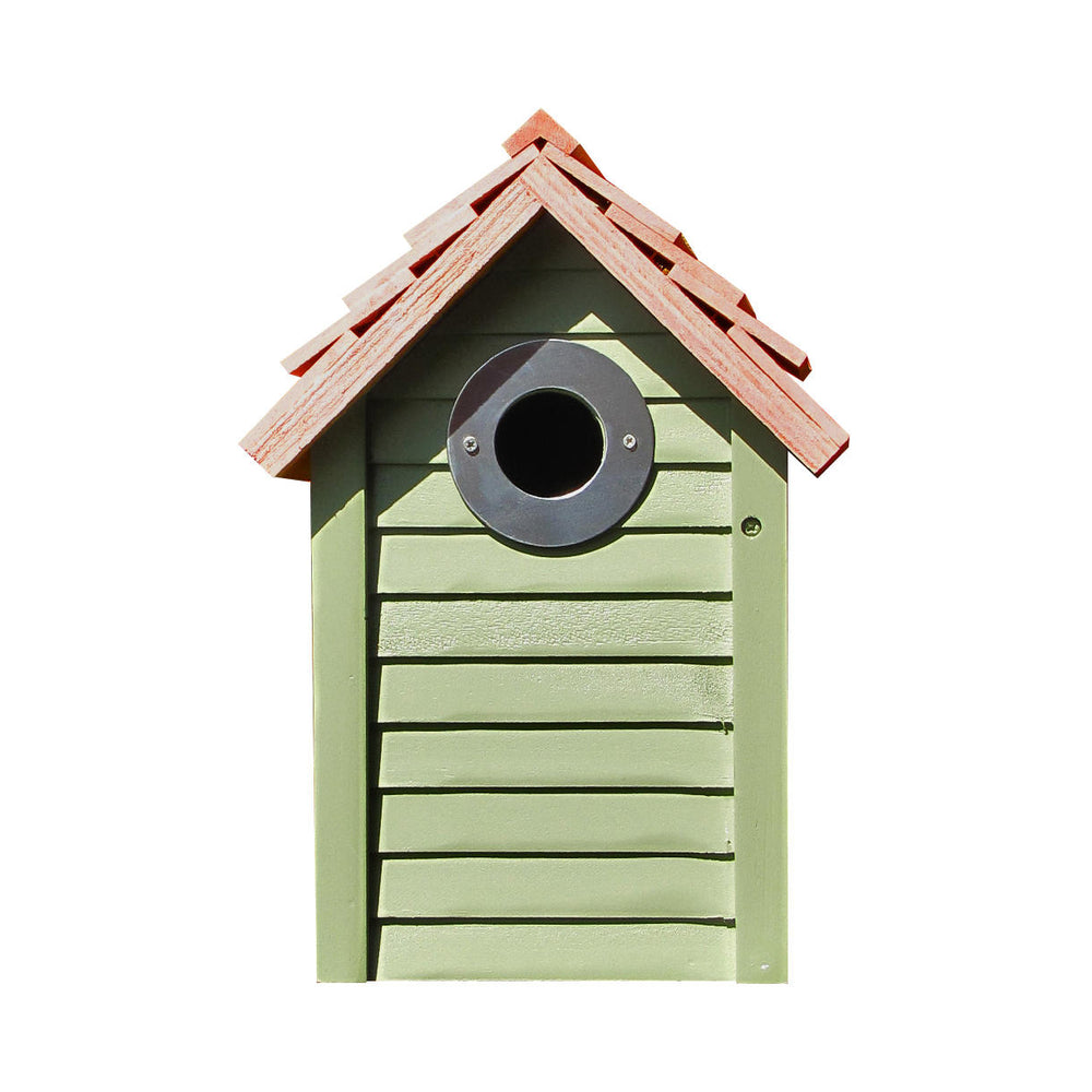 In soft green,with a natural cedar shingle roof, the New England nest box is both stylish and practical.