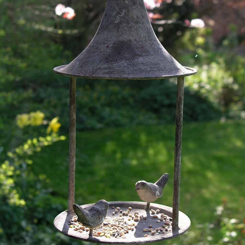 Simple rustic style hanging bird table in metal with a distressed aged iron finish. Complete with chain and hook.