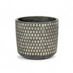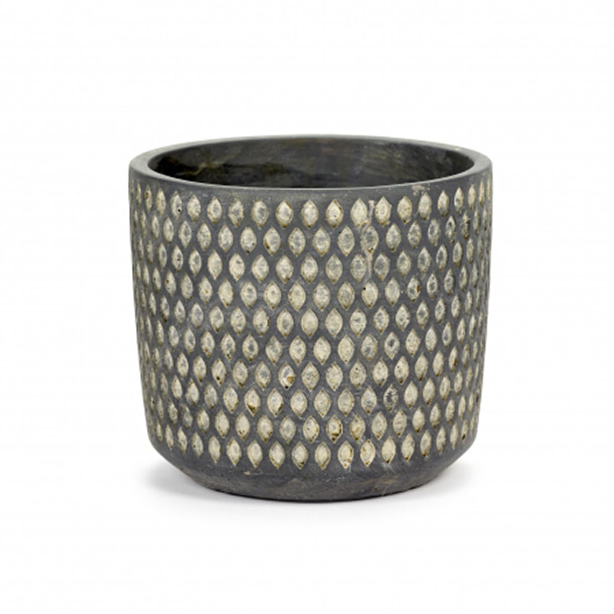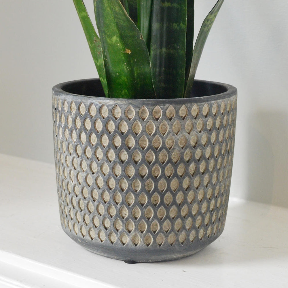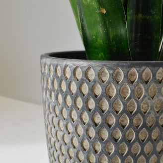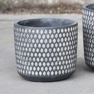 Dark charcoal grey pot with brushed off white chalking to enchance the dimpled design.