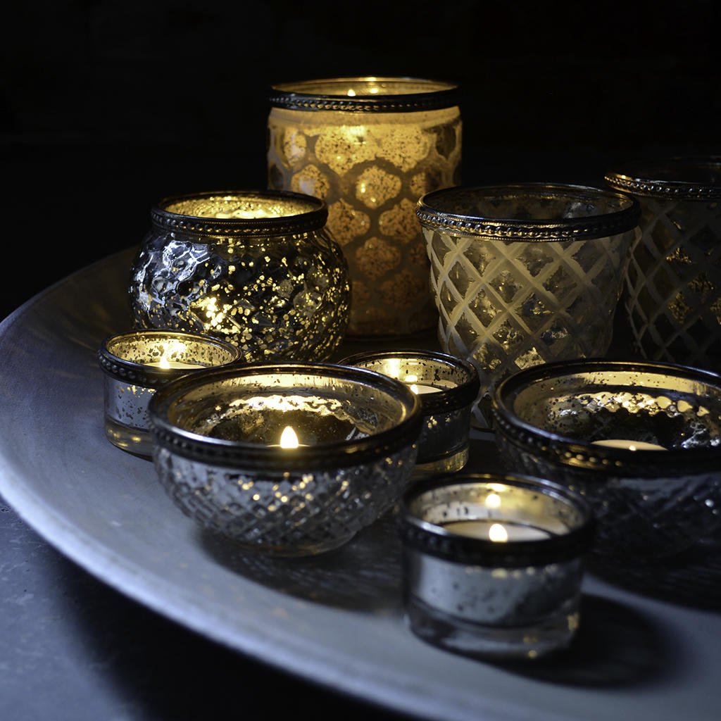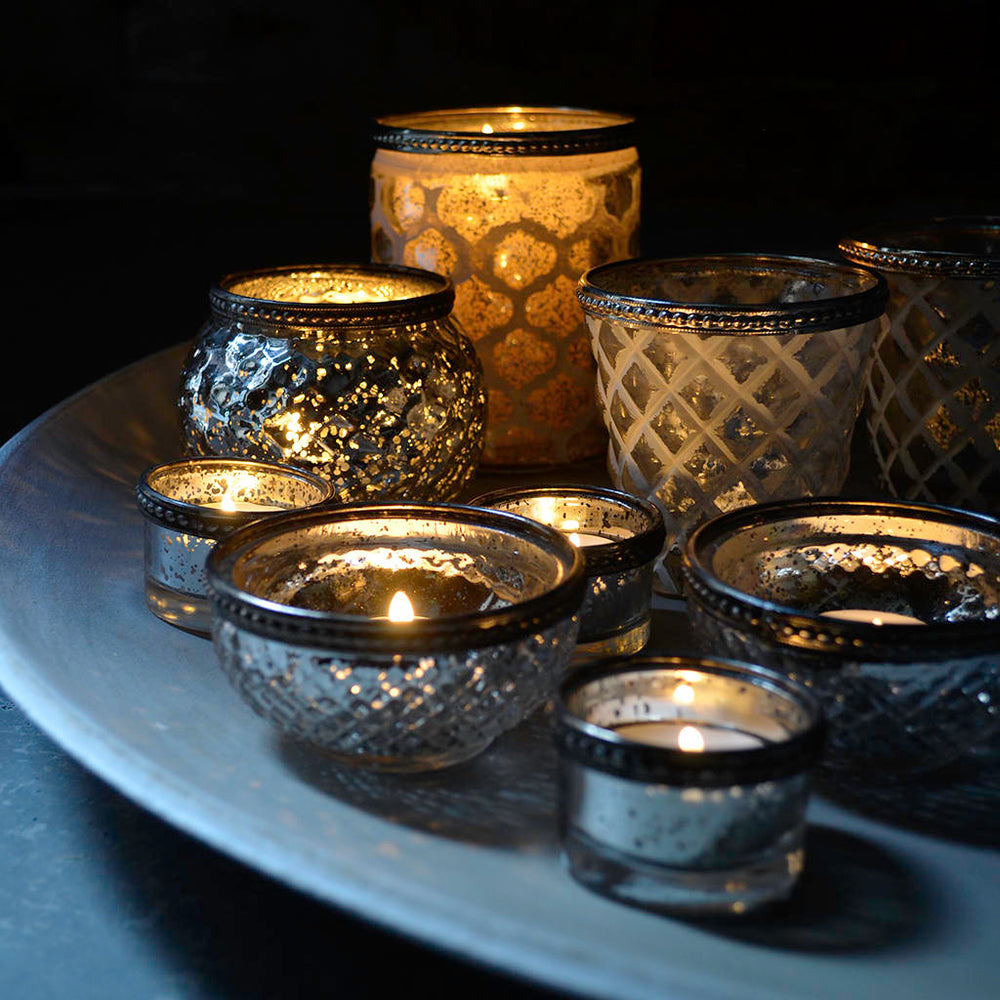Create a stunning tea light display with this collection of mercury glass tea lights - mix and match sizes and shapes.