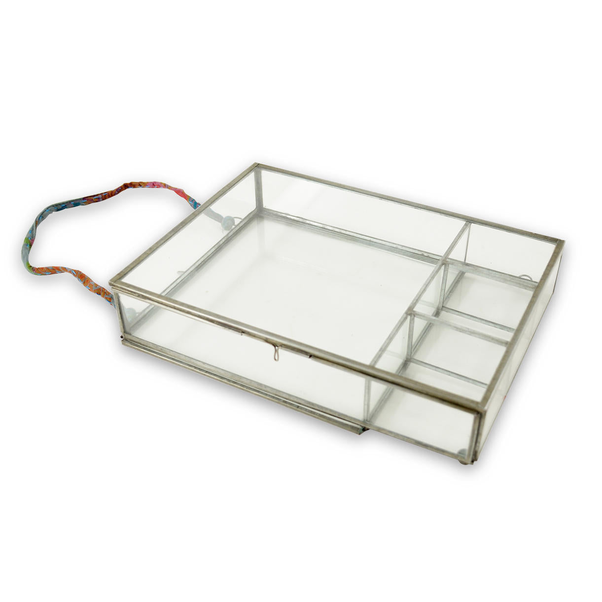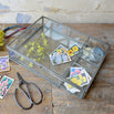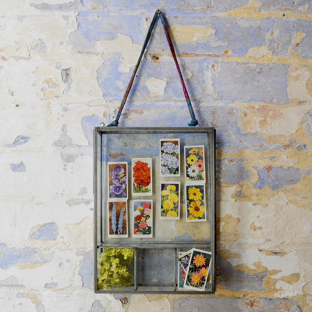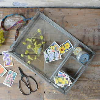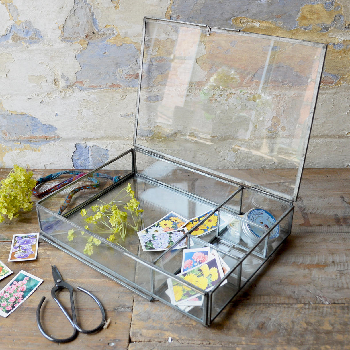 Box has 4 different compartments with a glass base, perfect to display small photographs, flowers, feathers and other treasured memorabilia from the garden.