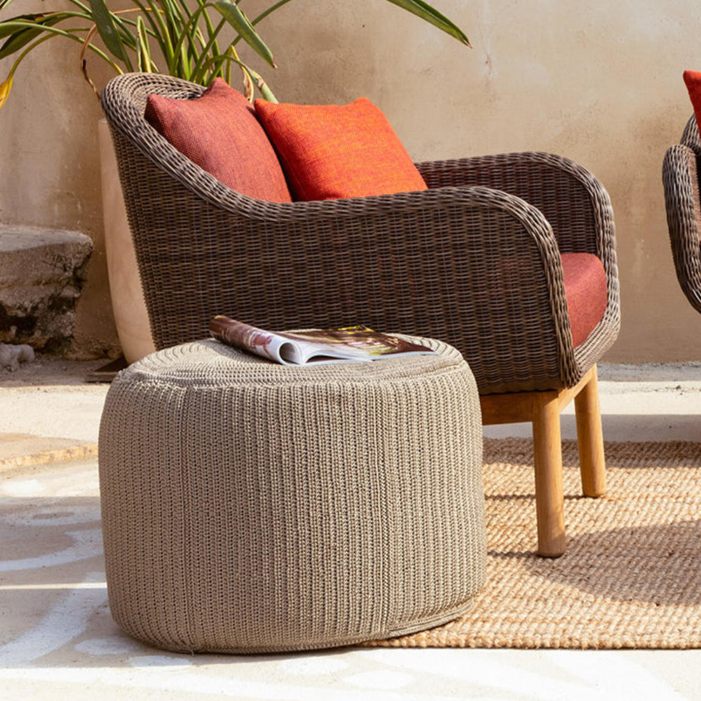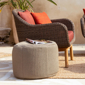 The weave is made in an outdoor fabric with solid teak legs. This can be left outside all year round with the legs weathering to a soft silver grey colour.