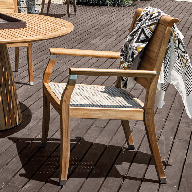 Elegant styled chair taking influence from plantation style furniture, the Arlington Dining chair by Gloster is a harmonious blend of a all weather weave with a buffed teak frame.
