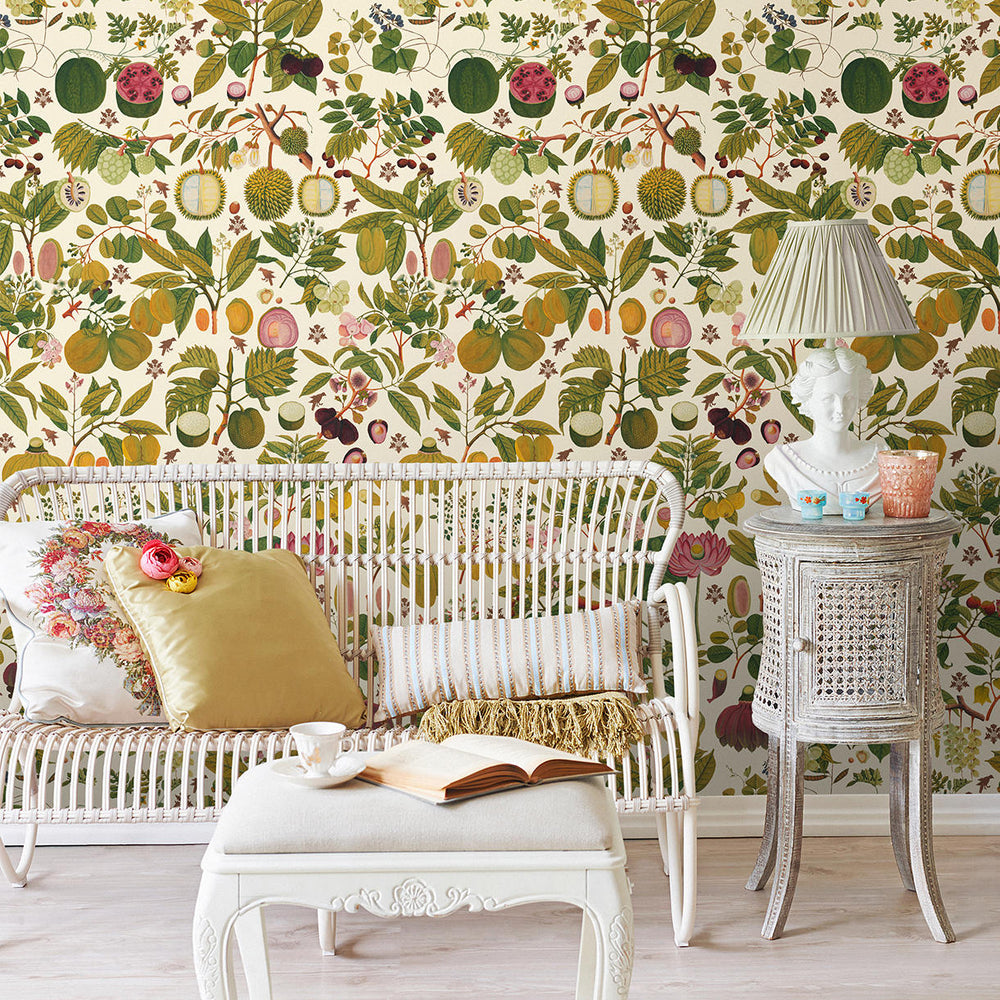 Bring a little bit of South East Asia to your garden room with this tasteful, fruity wallpaper, featuring regional fruits and flowers such as the infamously spiky and pungent king of the fruits, the durian.