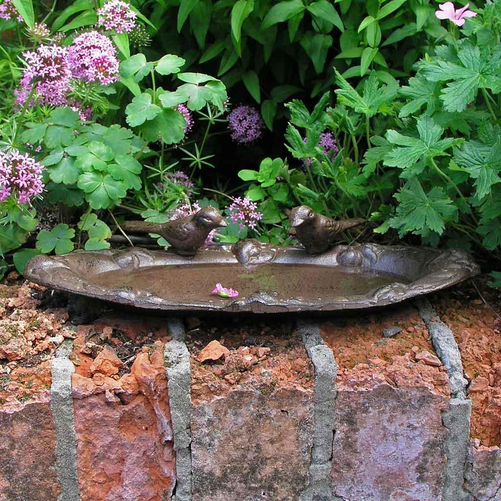Beautiful small bird waterer in bronze rust cast iron.