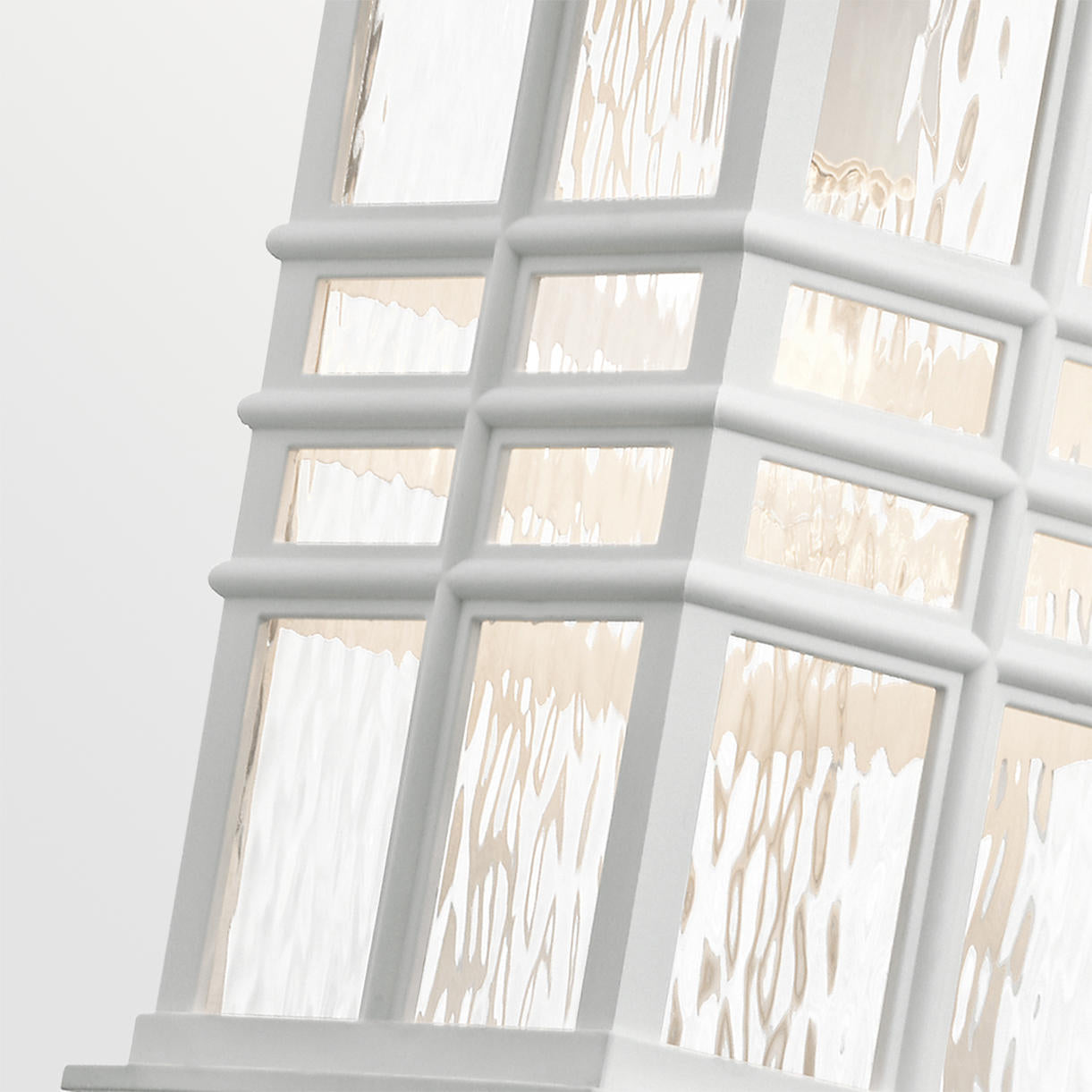 The Beacon Square outdoor collection of lights is inspired by classic architecture features clean lines and hammered glass.