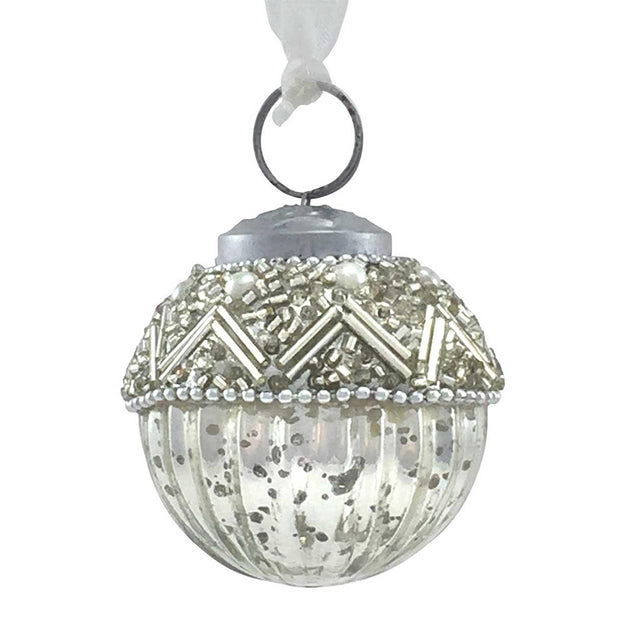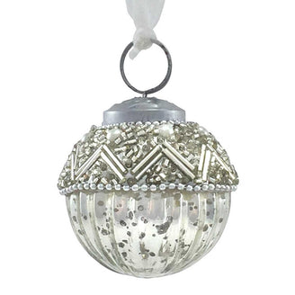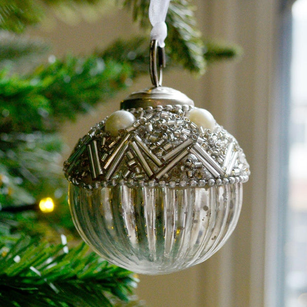 Gorgeous mercury silver bauble with heavily beaded silver and pearl ringed detailing.