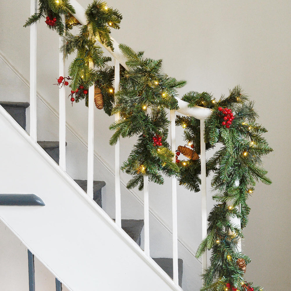 This battery operated faux berry and cone Christmas garland looks lovely just with its 80 warm white lights.