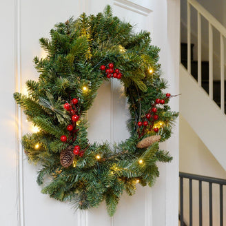 This battery operated faux berry and cone Christmas wreath looks lovely just with its 40 warm white lights.