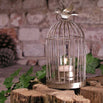 Pretty little gold birdcage tealight holder. Comes with a glass votive to protect the tealight or small candle from draughts - so it could be used outside.