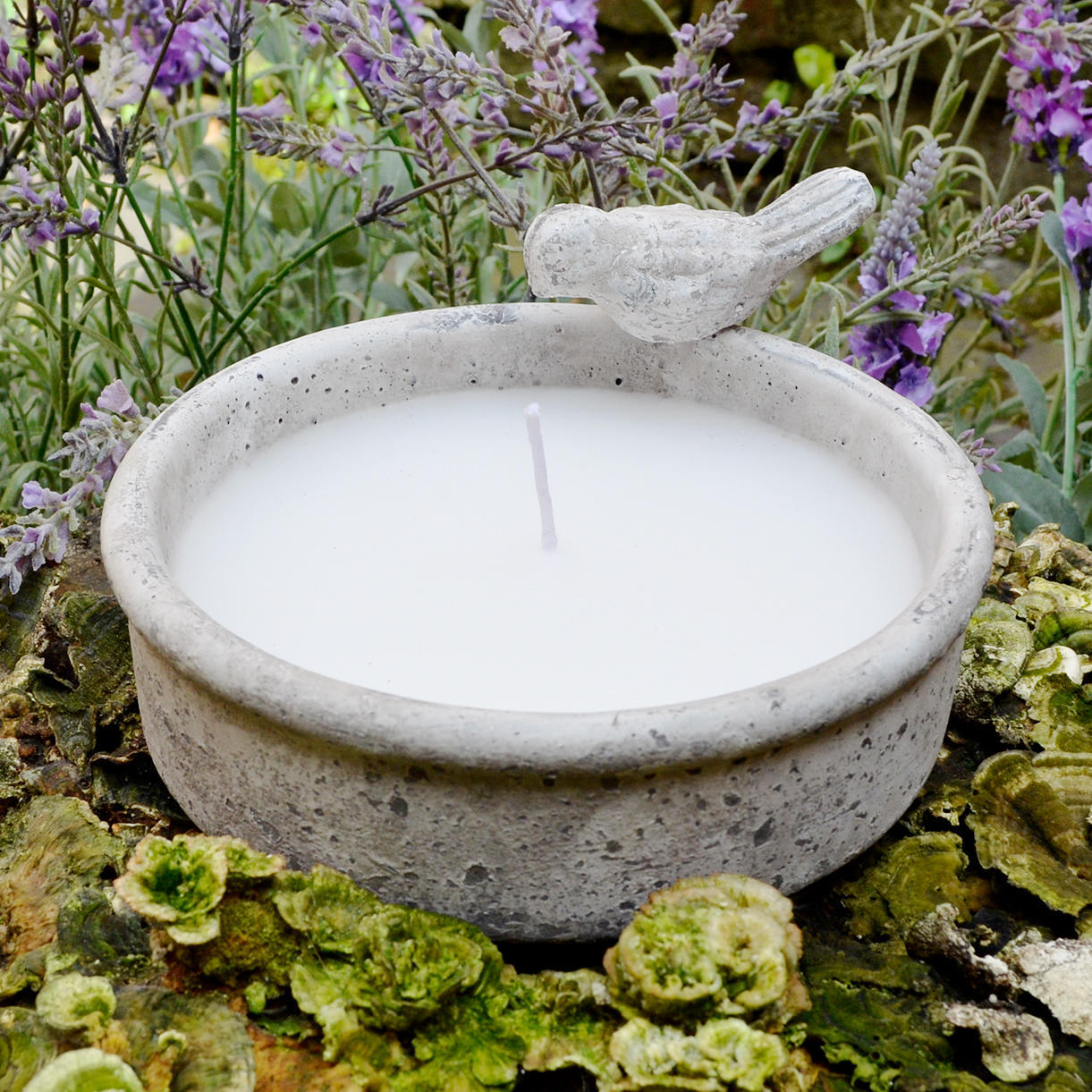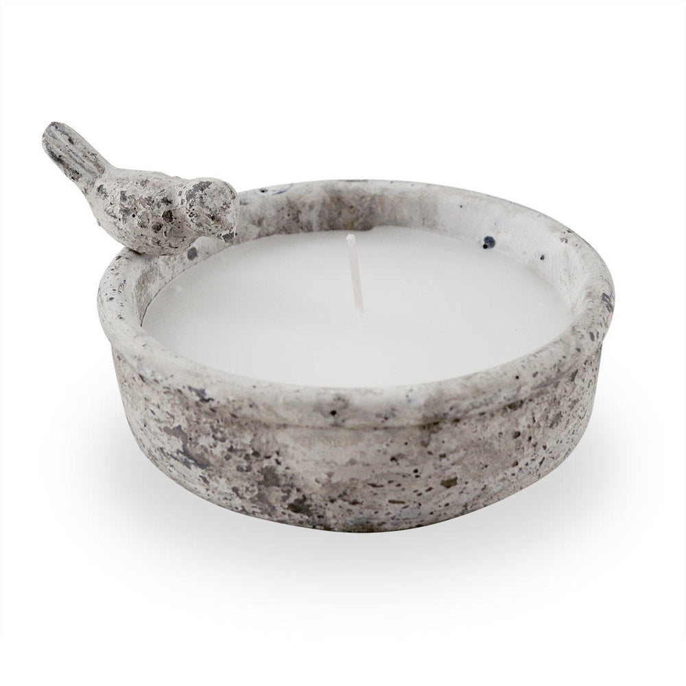 Lovely little stone bird dish filled with candle wax, use as a bird feeder or bird bath once all the candle has been used.
