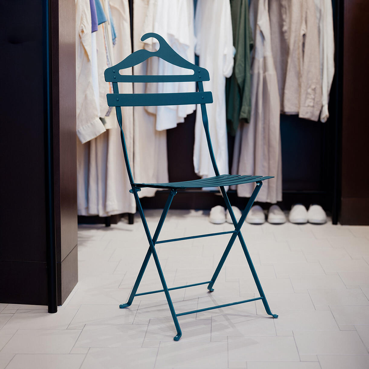 This Valet bistro chair has been given an edgy design twist by Fermob, influenced by the valet stands found in boutique hotels. Not only can you hang your jacket with ease on the back of the chair, you can use the hook to smartly hang up the chair itself.