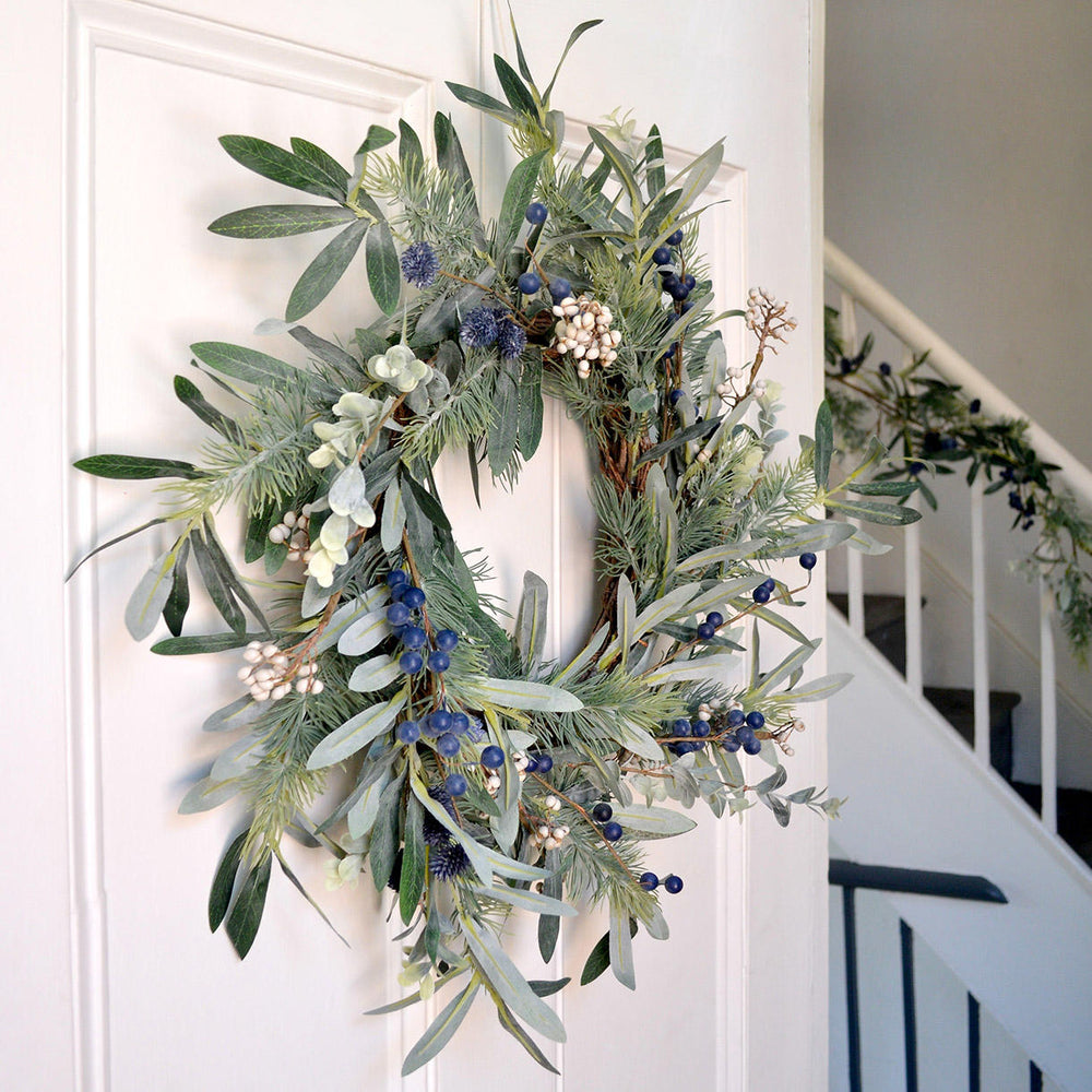 Featuring olive leaves and pine branches in soft green tones, complemented with deep blueberries, white snowberries and blue thistles.