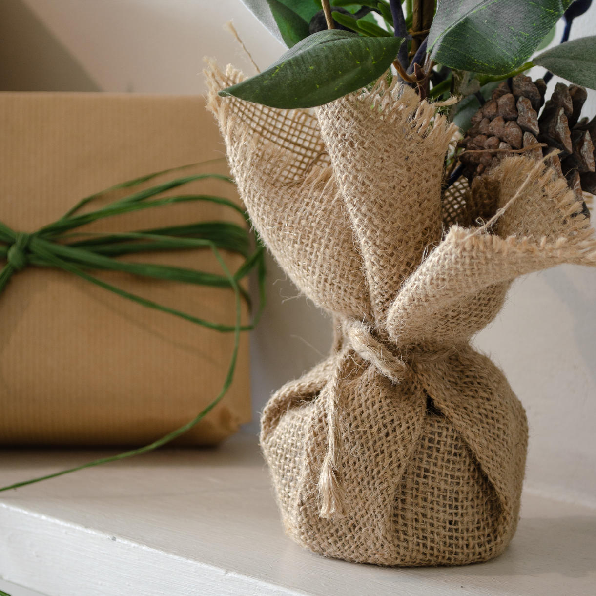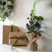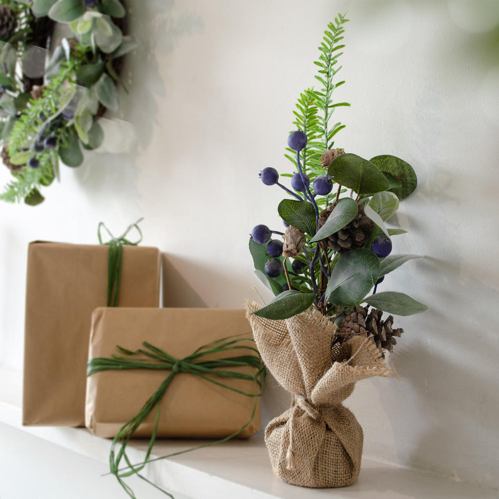 This soft wintery blue and green floral arrangement is a collection of pine leaves and pine branches.
