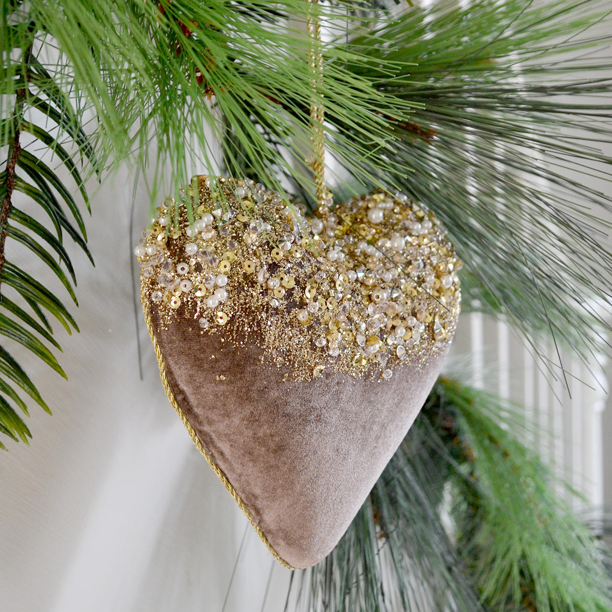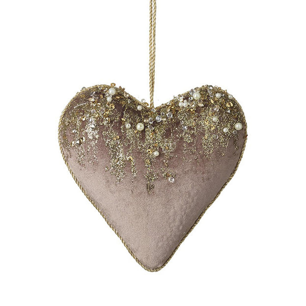 This oversized hanging heart in gorgeous blush velvet, dusted with mini pearls and beads, glitz and sparkle.