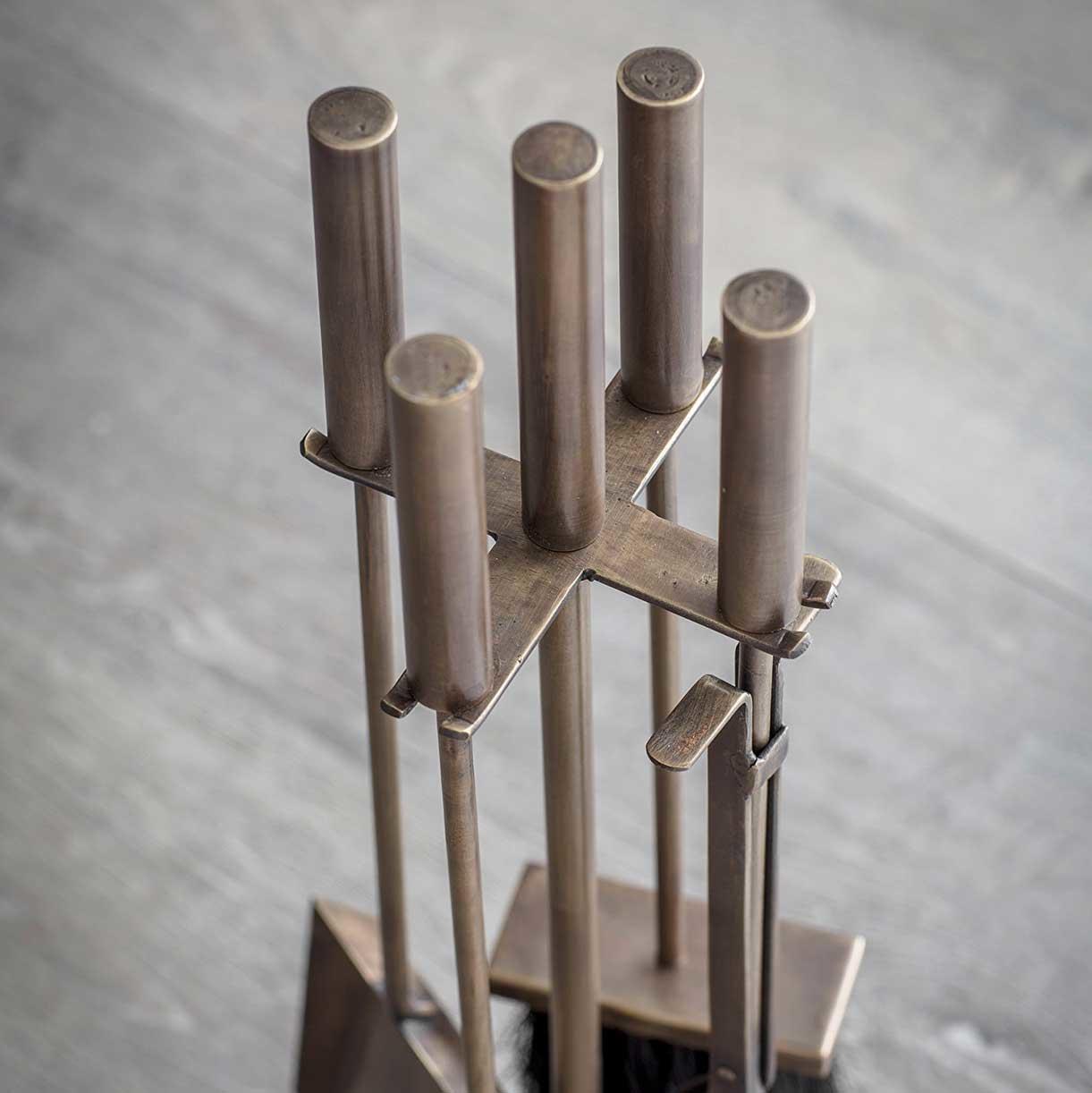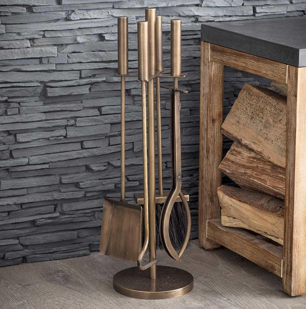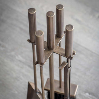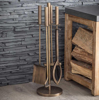 Elegant brass, contemporary 4-piece fireside tool set, on a simple and steam-lined stand.