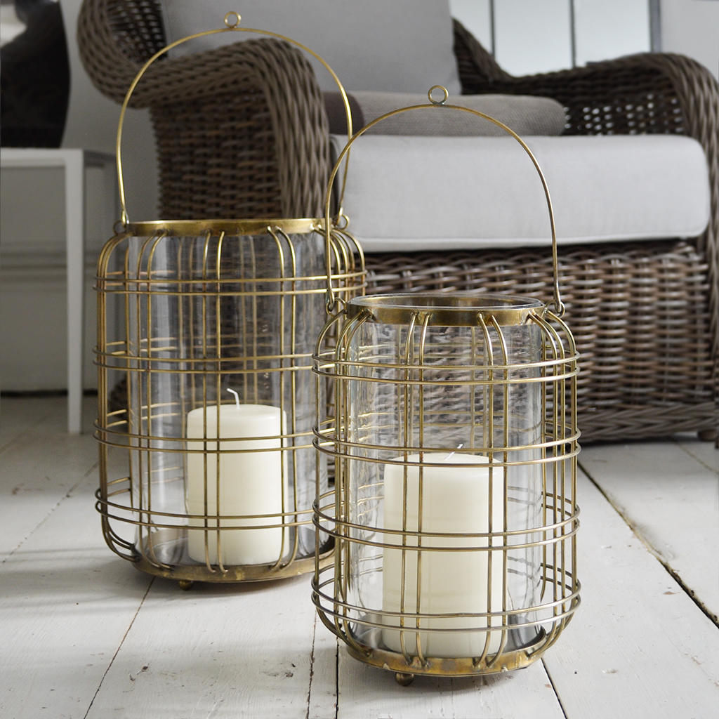 These beautiful brass wirework hurricane lanterns will give extra atmosphere to your garden or conservatory.
