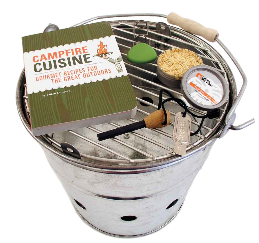 - handy to keep in the boot of the car for impromtu barbies. Contains:- Galvanised BBQ Bucket Oak FireSteel; Swedish army inventiveness to light your BBQ in all weathers without matches. Quicker than two girl guides. Grandpa's Fire Fork; a unique device for holding food over an open flame. Maya Dust; - natural flammable MayaDust to light your BBQ with ease in conjunction with your firesteel. plus Campfire Cusine Book; with great original recipes for the Great Outdoors by Robin Donovan As seen in County Living Magazine August 2009.