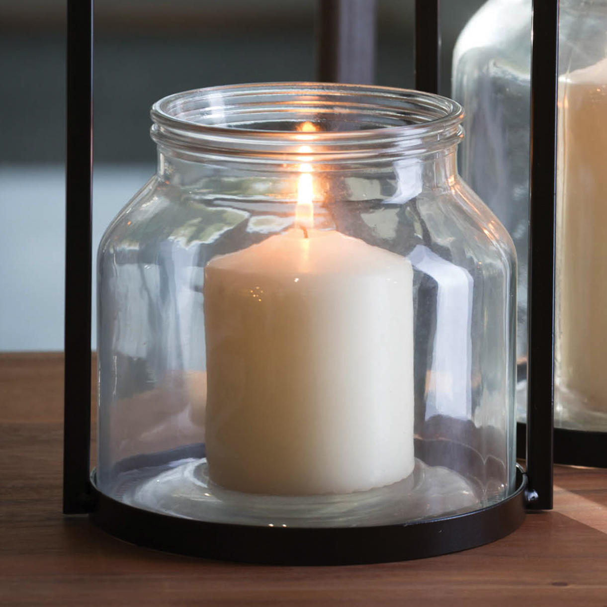 Each lantern has a sleek black-handled metal frame, encased in textured glass hurricanes that not only shield the flame but also create a mesmerising shimmer and glow in the candlelight.