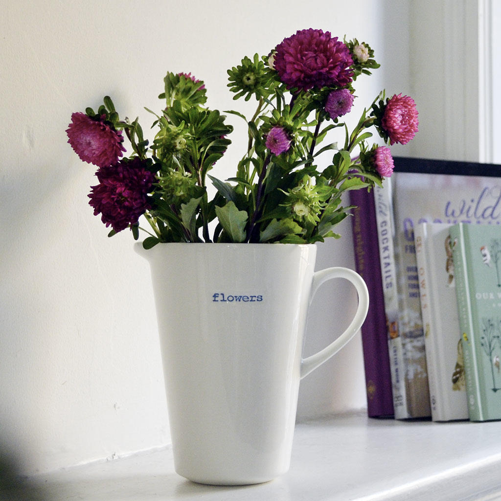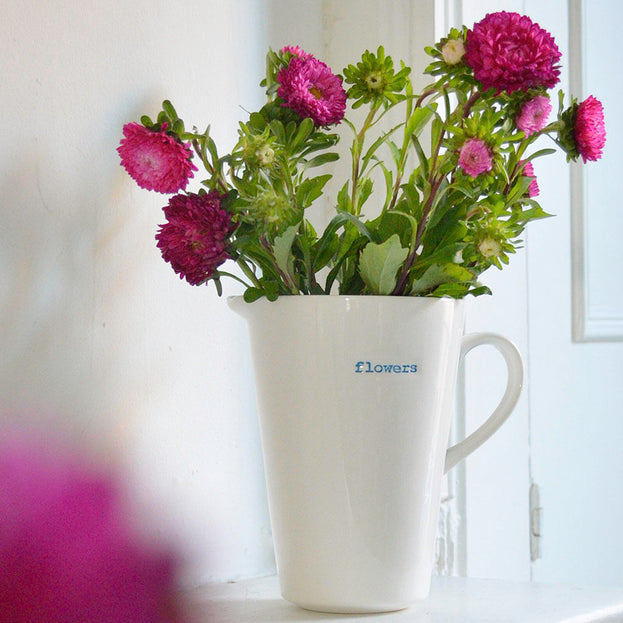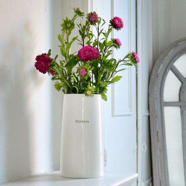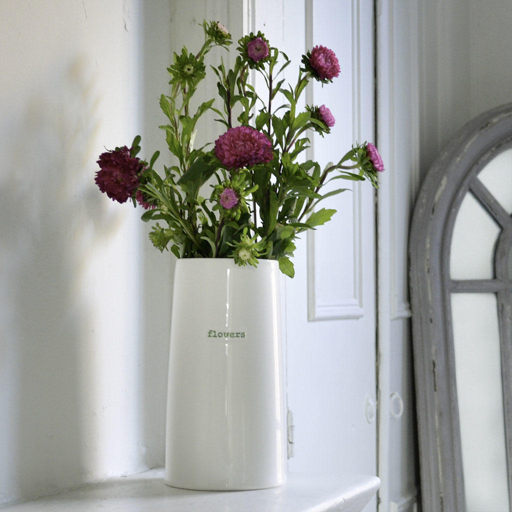 Each vase is hand-stamped with the word 'flowers' in the traditional typewriter font, for a touch of detail.