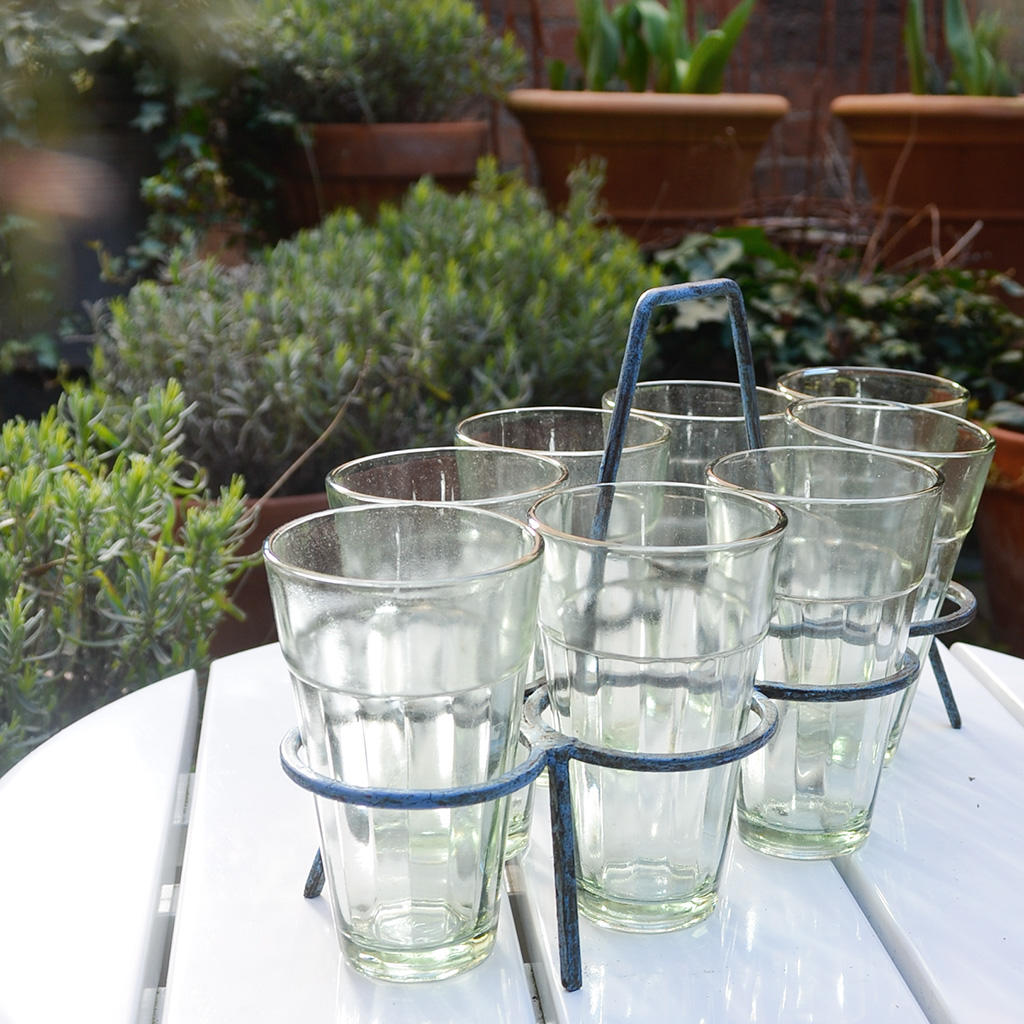 This set of 8 chai glasses in a vintage style blue metal holder is just perfect for summer alfresco entertaining.