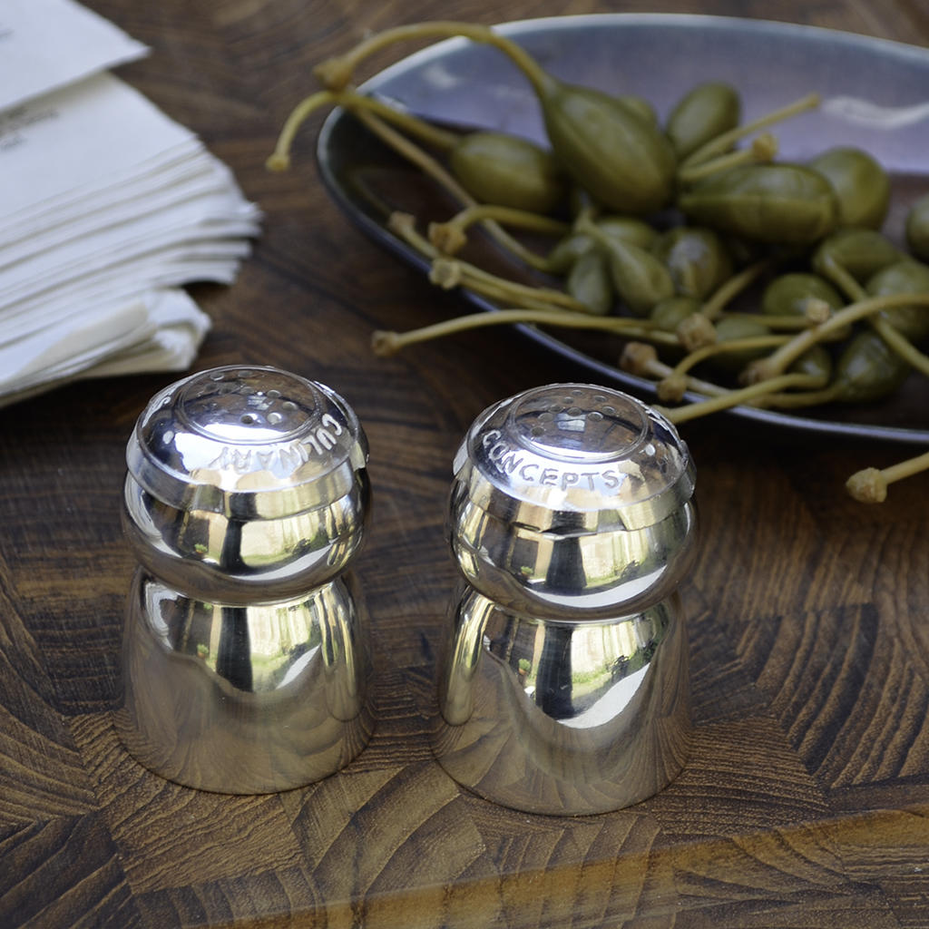 Life size Champagne cork stopper cruet set made from silver plate and presented in a gift box.