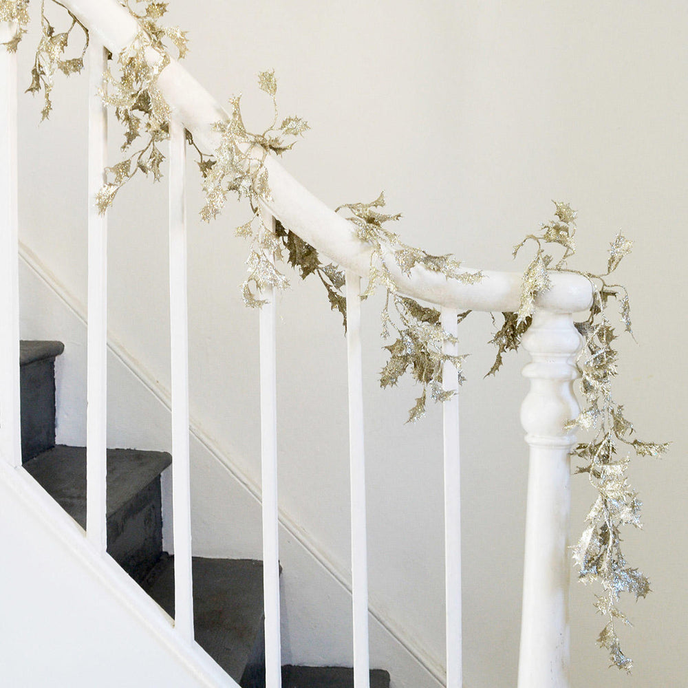 In beautiful soft champagne, bathed in soft glitter these holly garlands make for stunning Christmas floral arrangements around your bannisters and hallways.