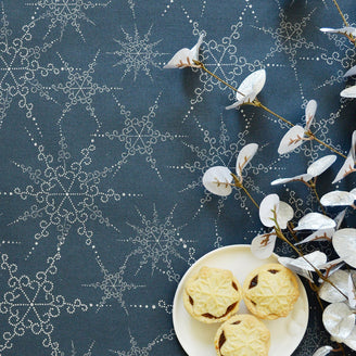 Functional and utilitarian disguised into something simply delightful, with this Nordic midnight blue abstract snowflake design. This coated cotton cloth will complement any space it resides.