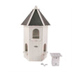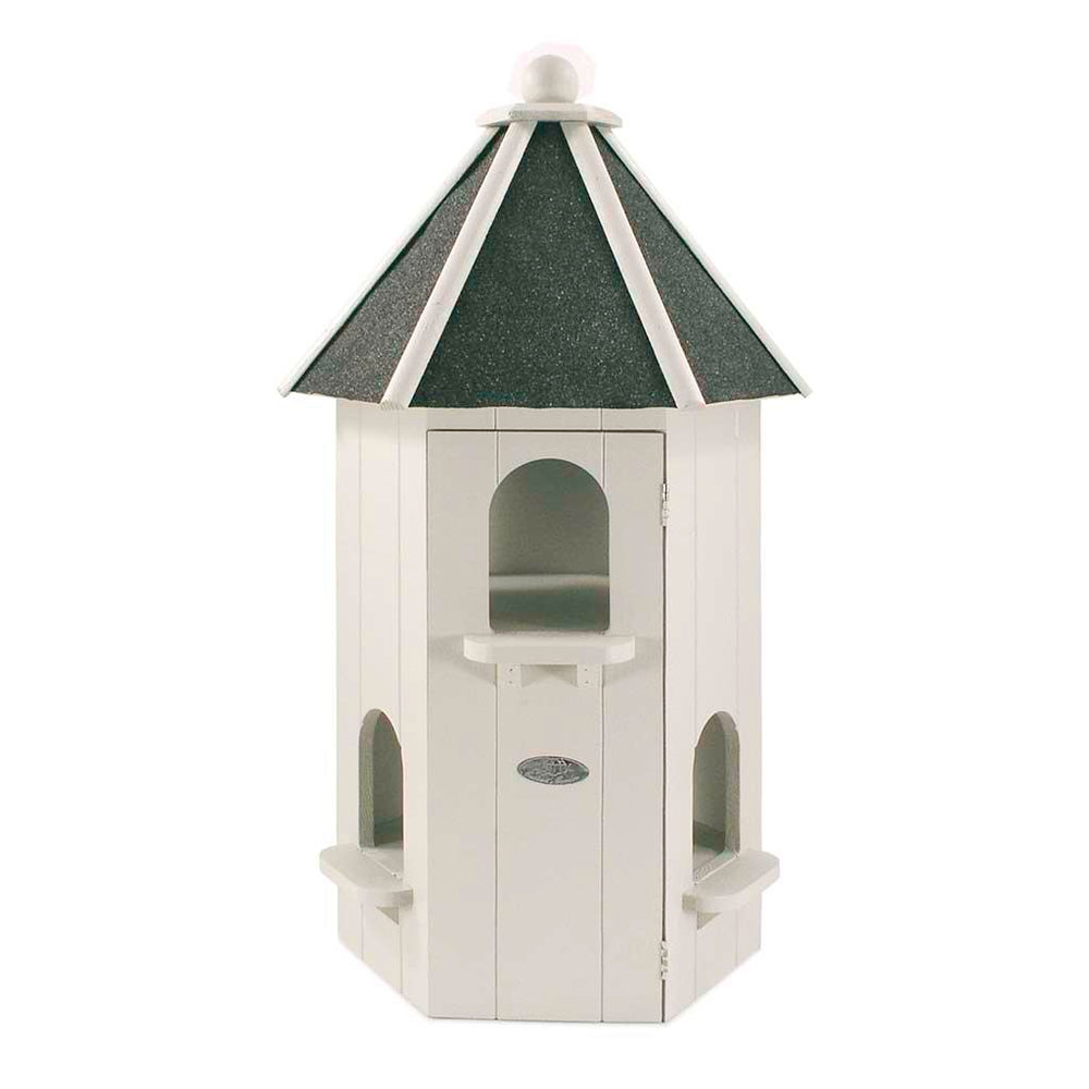 Pretty hexagonal shaped wooden Dovecote, painted in a soft traditional off-white colour. The roof has an asphalt covering on it for extra protection. There is a hinged door at the front for cleaning.